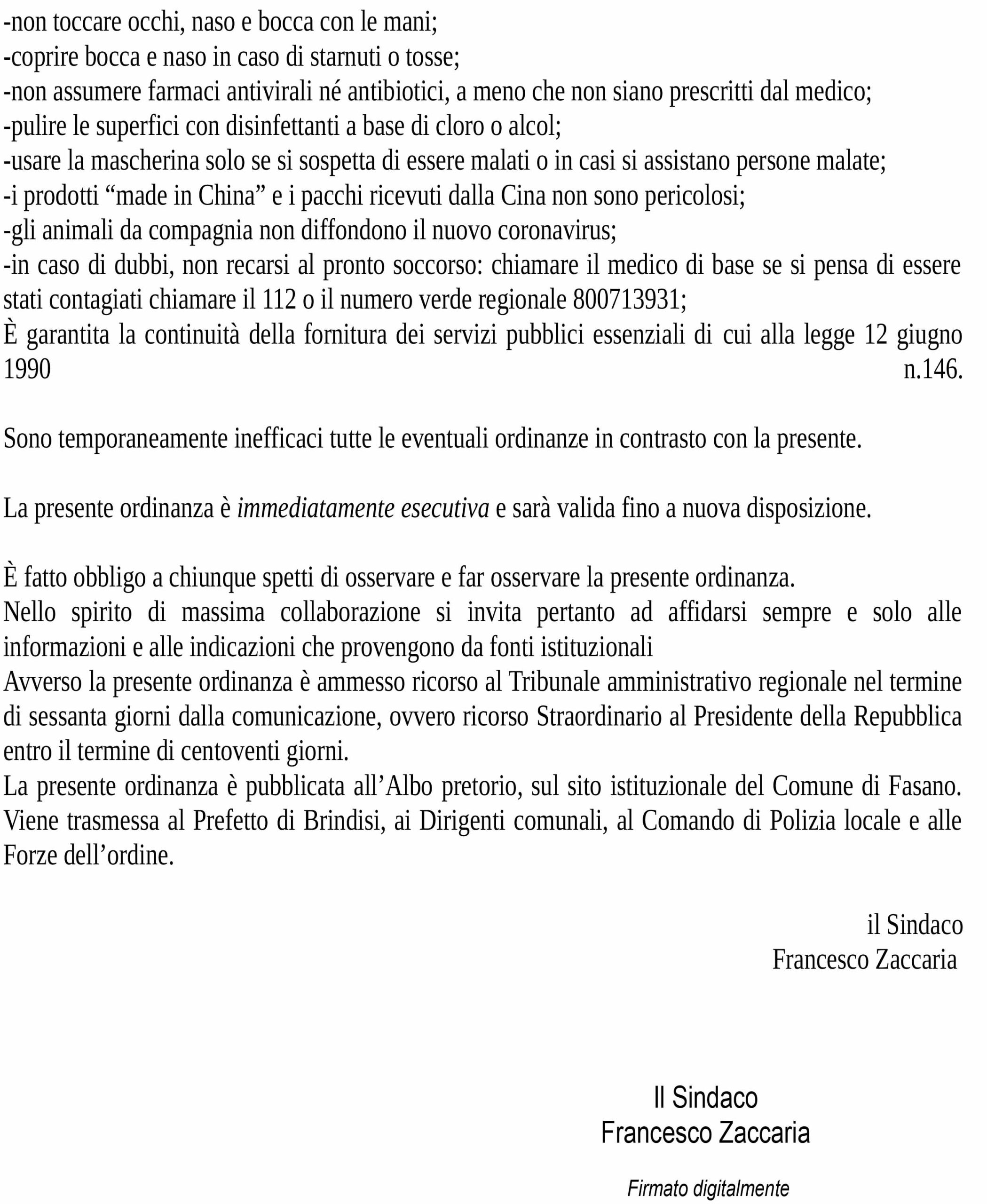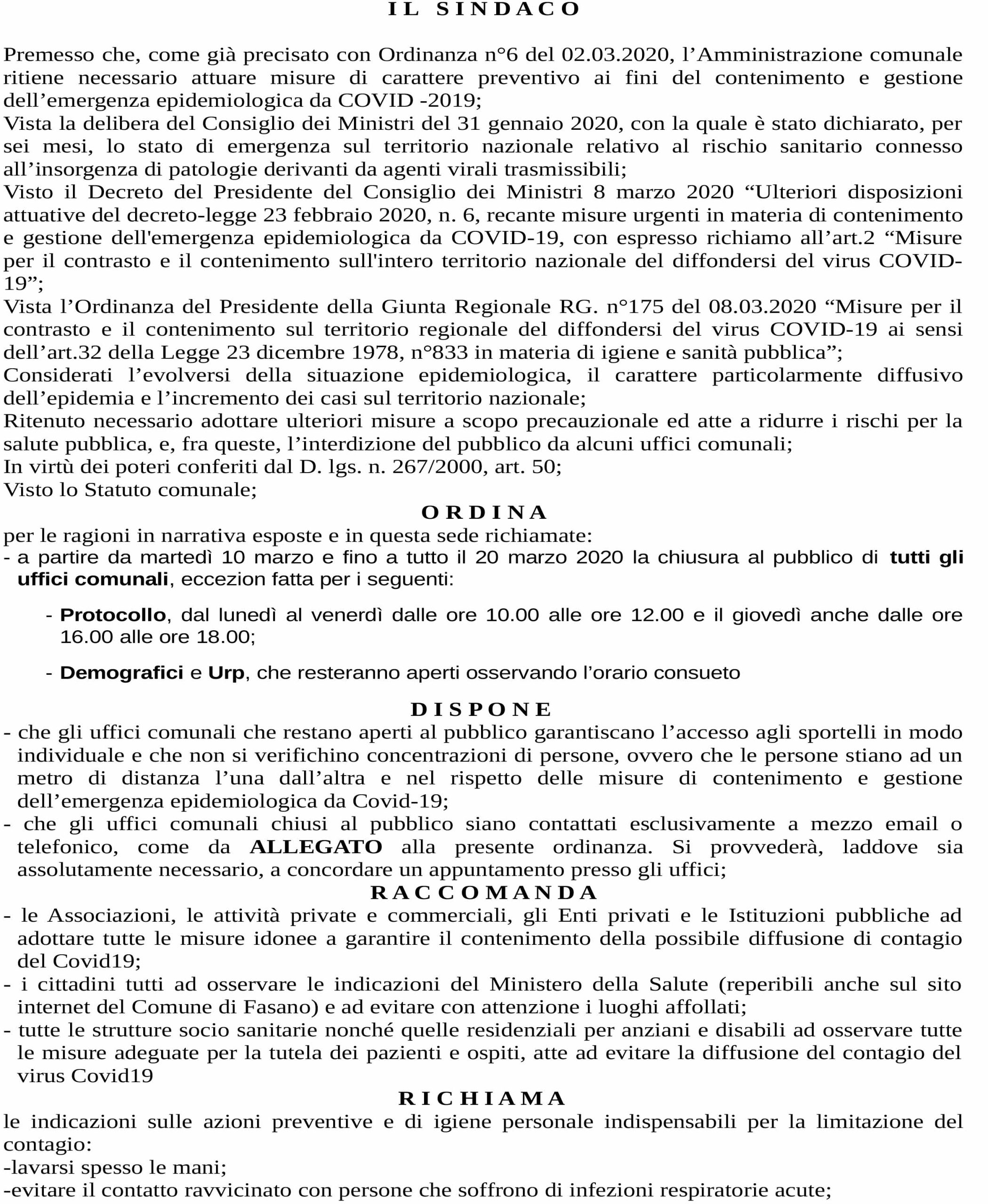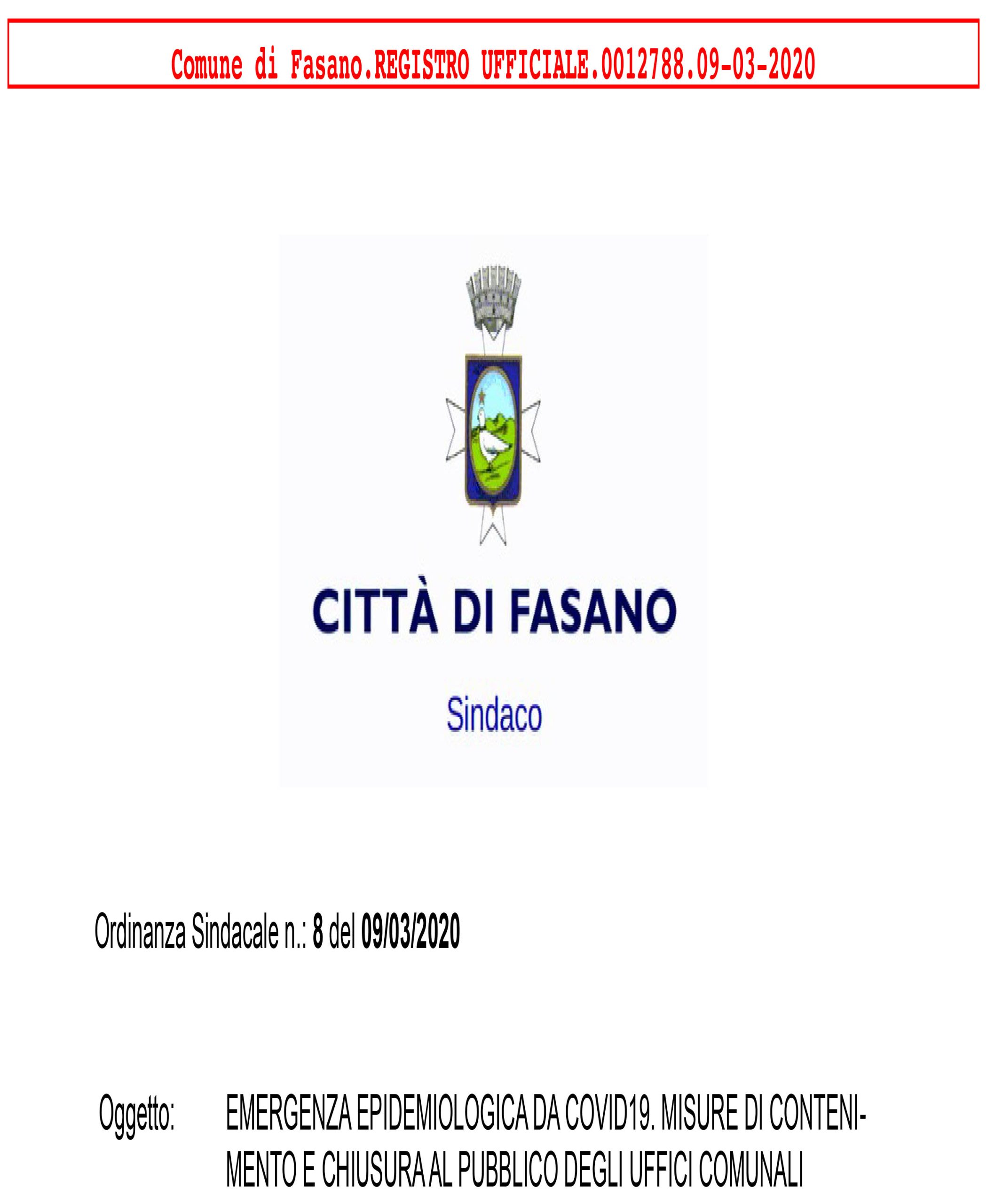 Fasano – Il sindaco di Fasano, Francesco Zaccaria, ha firmato oggi un’ordinanza che chiude al pubblico gli uffici comunali, ad eccezione dell’Ufficio protocollo, dei Servizi demografici e dell’U.R.P, in conseguenza dei provvedimenti straordinari emanati dal Governo per contrastare la diffusione del cosiddetto “coronavirus”.