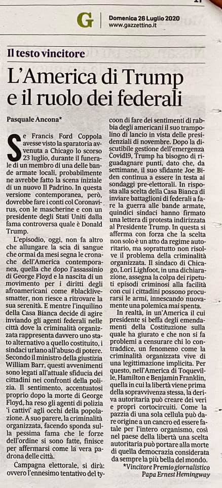 Il concorso è rivolto agli studenti universitari e delle Scuole di Giornalismo e per questa edizione l’articolo vincitore è firmato da Pasquale Ancona: analizzando la realtà politica degli Stati Uniti di Trump, il giornalista riflette sulla criminalità organizzata e sulla democrazia “più bella del mondo” che pare essere in pericolo.