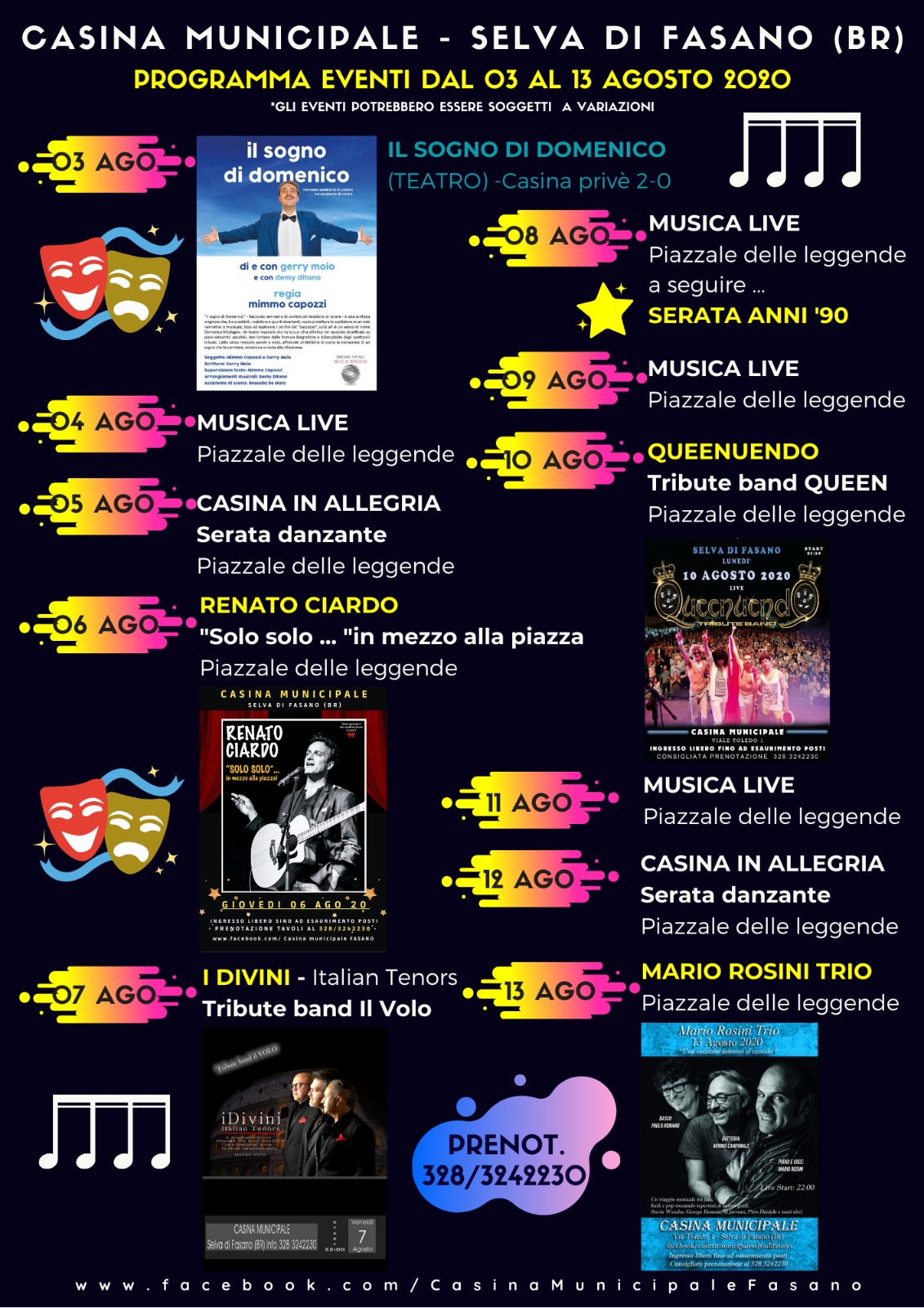Il 6 agosto la verve comica e musicale di Renato Ciardo nel suo spettacolo “Solo solo… in mezzo alla piazza”, mentre il 7 una coinvolgente tribute bande de Il Volo, I Divini, allieterà la serata con il concerto. “Italian Tenors”.