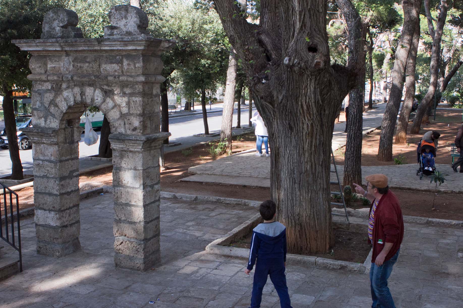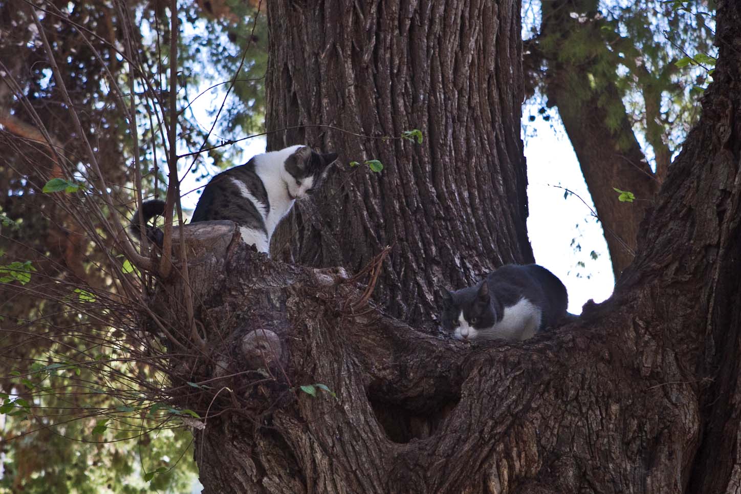 FASANO – Ormai sono un simbolo della villa comunale di Fasano e idoli dei tanti bambini che quotidianamente vanno nel parco a giocare. Cip e Ciop (questo il nome dato loro dall’ex custode della villa Marco Mancini) sono due gatti, un maschio e una femmina, nati due anni fa su uno dei tanti alberi presenti nel Parco della Rimembranza. E da questo non sono mai scesi. Sono cresciuti insieme, grazie anche allo stesso Mancini, che li ha nutriti e provveduto ad ogni loro bisogno. Ieri (sabato 3 novembre) la coppia ha festeggiato una sorta di compleanno e tanti cittadini, ormai affezionatisi ai due micioni, si sono portati sotto l’albero per guardarli giocare tra le fronde ormai spoglie dell’albero-casa. Piroette e salti, con Cip che si concedeva facilmente allo sguardo della gente mentre Ciop, decisamente più riservato, ha prima spiato da una delle tante fessure del tronco e poi è uscito allo scoperto.