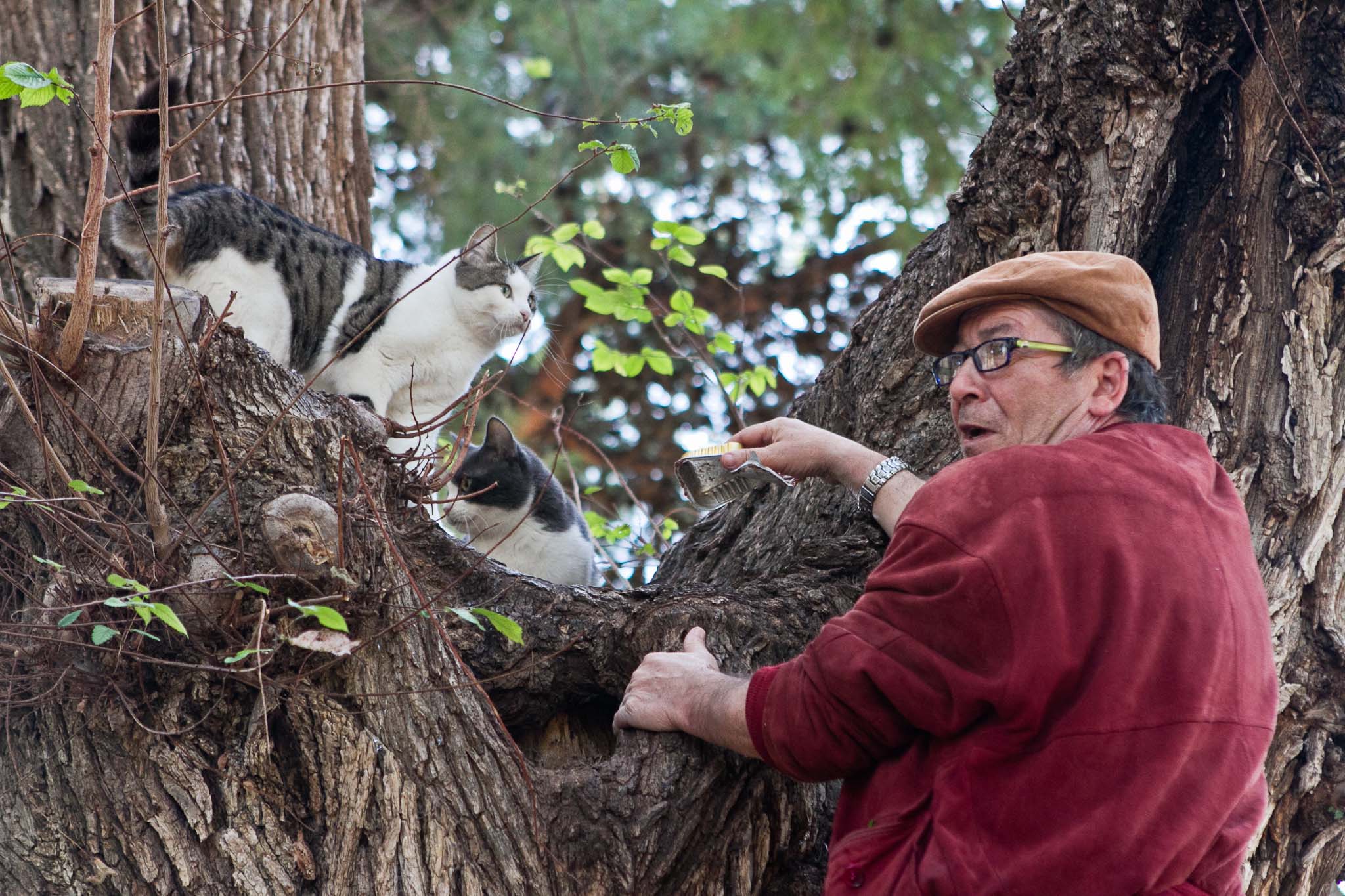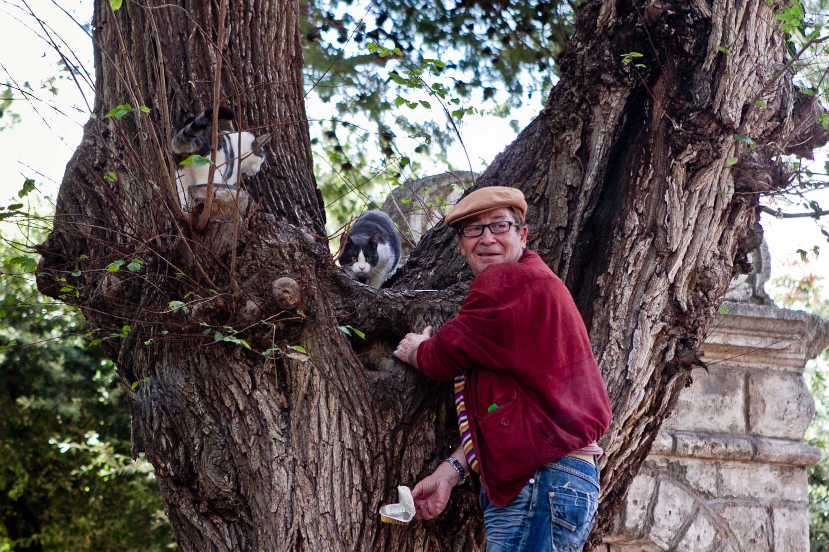 «Da quando li ho visti nascere mi sono preso cura di loro – spiega Mancini -. E anche ora che non sono più il custode della villa continuo a farlo anche perché non permettono a nessun altro di avvicinarsi. Devo ogni giorno munirmi di scala e portar loro da mangiare sull’albero in quanto non sono mai scesi da lì. E’ una cosa incredibile: sono riusciti a formare, probabilmente con gli artigli e nel corso dei mesi, anche dei ripari per quando il tempo non è clemente. Riconoscono la mia voce e se dico “coccole” si sdraiano aspettando le mie carezze». Un amore incredibile tra quest’uomo e la coppia di animali. E se qualcuno chiede che faranno i gatti quando il Comune deciderà di tagliare, come consigliato da alcuni esperti, gli alberi della villa comunale Mancini è lapidario nella risposta: «Prima dovranno tagliare me».