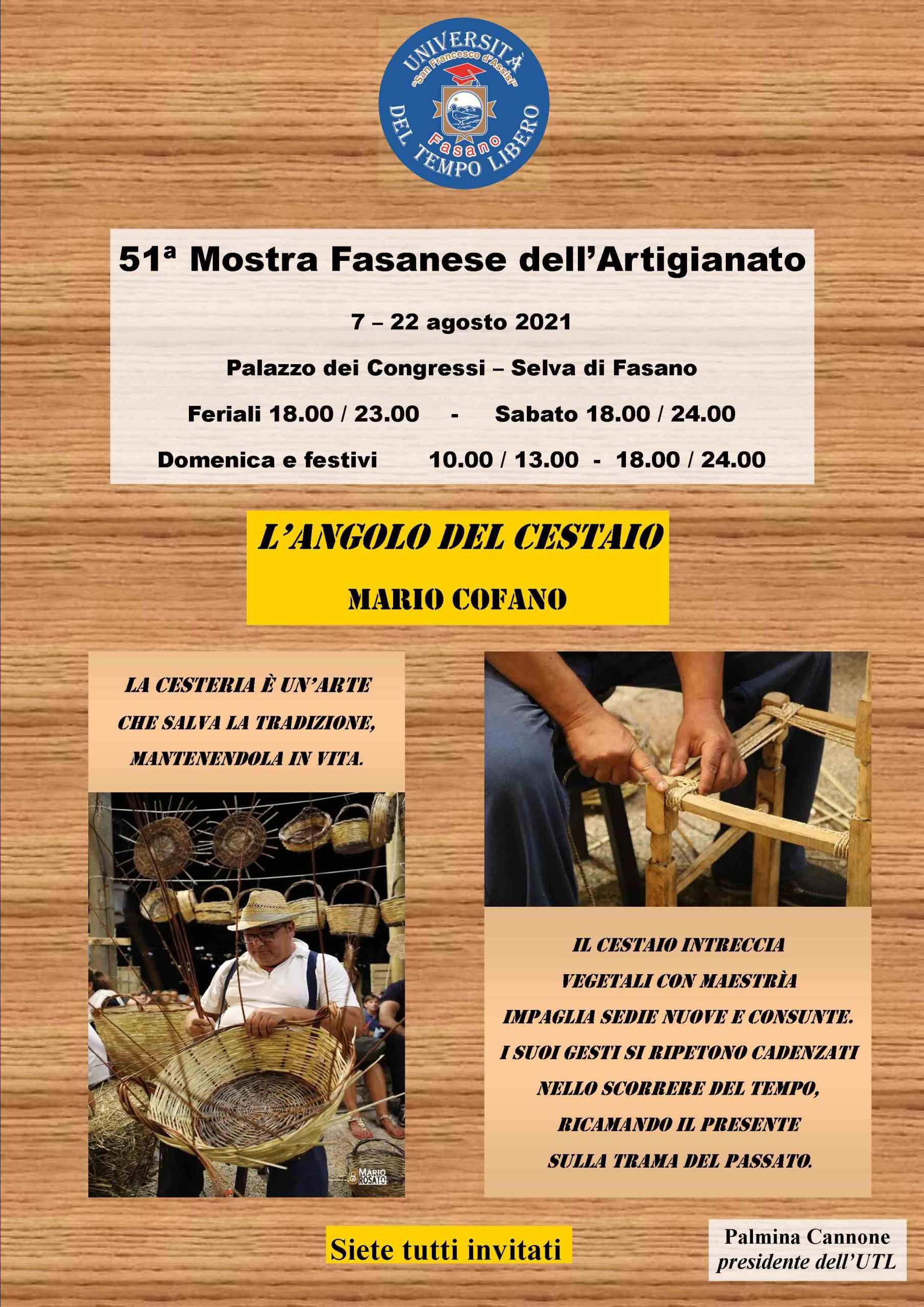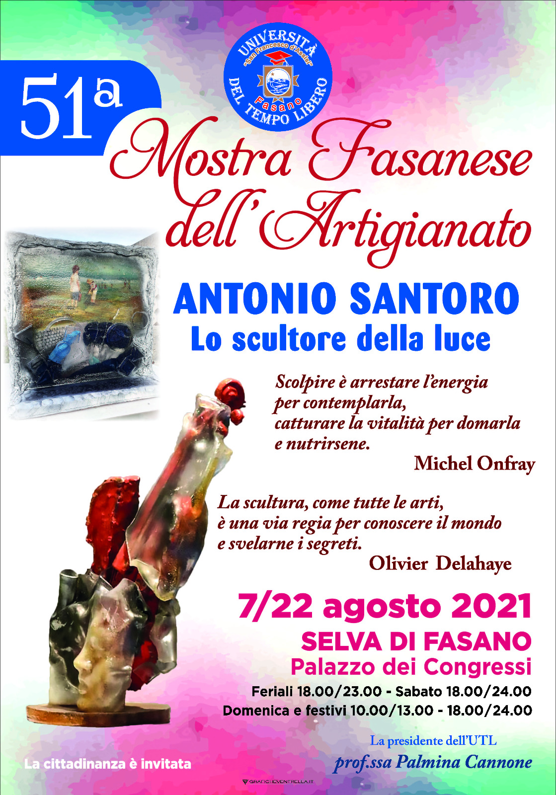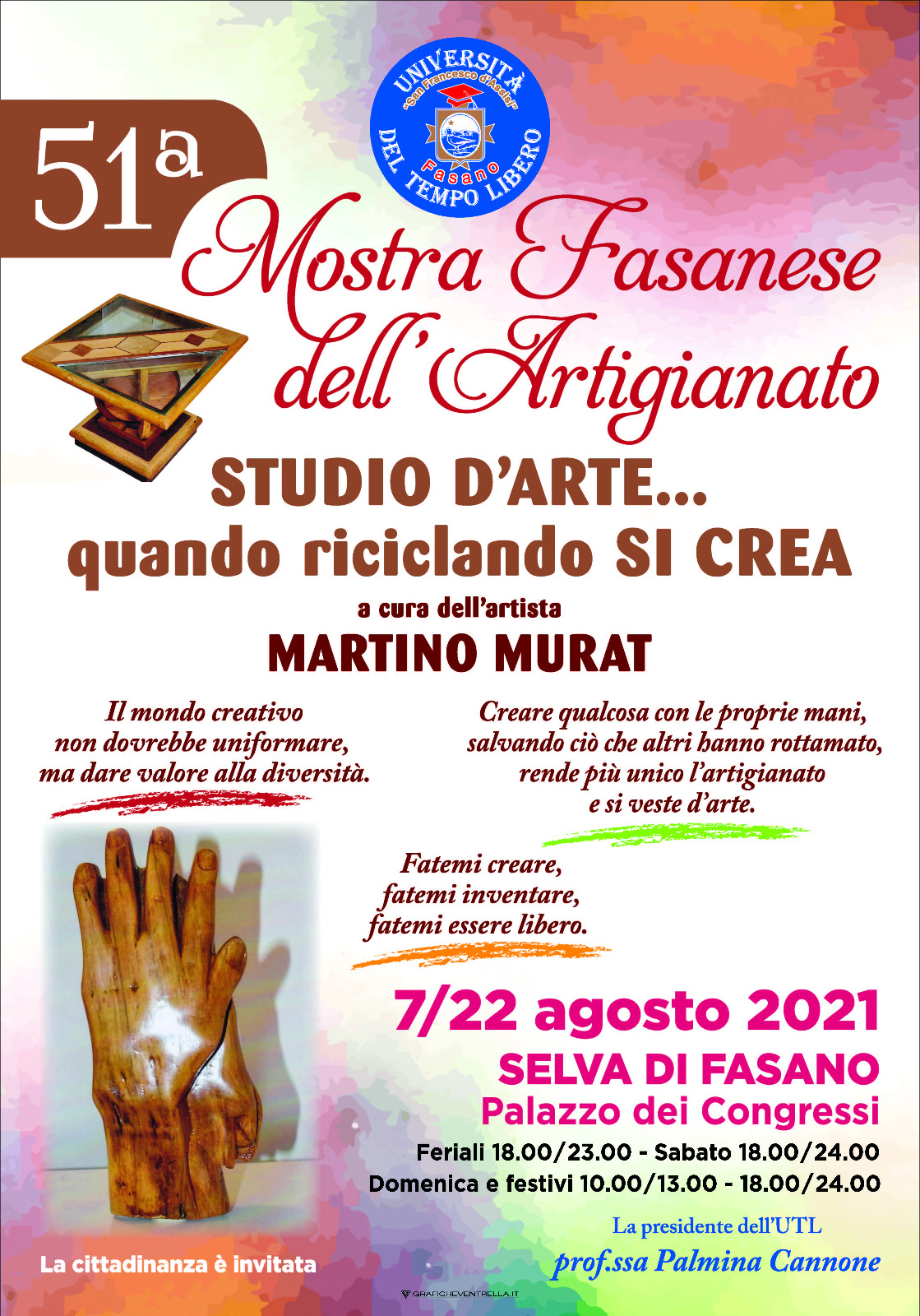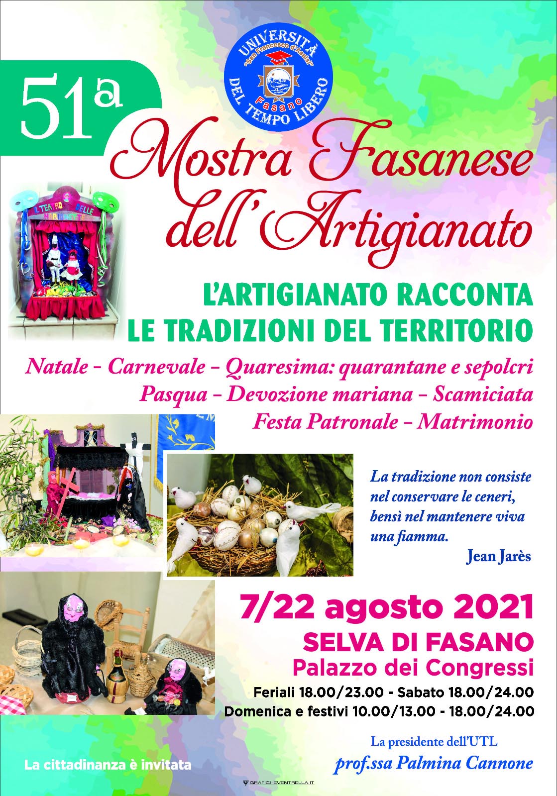 Fasano – Da otto anni consecutivi, l’Università del Tempo Libero di Fasano partecipa come partner alla Rassegna artigiana, giunta quest’anno alla 51ª edizione, apportando un valido contributo culturale, laboratoriale, e non solo. Quest’anno è presente alla kermesse con delle belle novità.  Lo stand “L’artigianato racconta le tradizioni del territorio”, consuetudini sospese a causa del Covid, propone preziose opere dell’artista di Gioia del Colle, Giorgio Masi, che raffigurano: Il Natale tra gli ulivi, Il presepe della tradizione e Gli antichi mestieri. Si passa poi agli straordinari costumi di Carnevale, eseguiti a mano: Il re della Taranta, Volo di farfalle e La vedova allegra, disegnati e realizzati dall’eclettico artista di Brindisi, Angelo Antelmi, noto a Parigi e a Venezia. Il percorso seguita con Il teatrino delle marionette, La Quaresimacon Quarantane in miniatura e Il Sepolcro della socia Annarosa Cincavalli. La Pasqua è raffigurata da uova decorate a mano e colombe dell’esperta Pasquina Calandrella. Non potevano mancare: La devozione mariana, molto viva a Fasano, La Scamiciata e La Festa patronale con luminarie e cassarmonica. Conclude l’iter Il matrimonio con l’esposizione di un romantico abito da sposa realizzato dalla maestra stilista Lucia Barletta, che da poco ha chiuso l’attività; un ventaglio e un ombrellino a uncinetto della Calandrella. Nello stesso stand anche una preziosa ringhiera in ferro battuto del fabbro – chitarrista Gino Guarini (Bommèine). Sulle pareti si possono ammirare scatti fotografici del territorio e straordinarie foto di Martino Murat. Uscendo da questo stand, l’UTL presenta al visitatore L’angolo del cestaio Mario Cofano con culle, testate di letto in midollino e ceste e panieri. E ancora l’UTL offre la bellezza delle sculture di Antonio Santoro, lo scultore della luce, famoso a livello internazionale. Il visitatore potrà emozionarsi dinanzi a creazioni di alto livello. Una chicca, poi, sempre curata dall’Università, è Lo studio d’arte… quando riciclando Si Crea del socio Martino Murat. L’artista, con materiale rottamato, ha realizzato con le proprie mani e il proprio estro mobili e sculture che fanno sognare. A latere, a cura dell’UTL, Laboratori artigianali gratuiti di filet, macramè, ricamo, tombolo, uncinetto, ferri, intrecci con vari materiali, creazioni artistiche, punto ago, taglio e cucito, borse personalizzate con le maestre artigiane: Argento Rosa, Barletta Lucia, Bungaro Maria, Calandrella Pasquina, Galiulo Adele, Messina Adriana, Milella Grazia, Zantonini Anna. Quanto agli eventi culturali e musicali, l’UTL organizzerà al Palazzo dei Congressi, mercoledì 11 agosto 2021, ore 19,00, Il lavoro dopo il Covid con collegamento alle economie sane inquinate dalle organizzazioni criminali, dott. Emanuele Esposito, criminologo; domenica 15 agosto 2021, ore 19,00, Musica d’estate con il Trio dell’UTL; e mercoledì 18 agosto 2021, ore 19,00, L’artigianato in quanto identità comunitaria, dott.ssa Rosanna D’Urso, sociologa. Pertanto, l’impegno dell’Universitas fasanese, dopo una laboriosa progettualità e relativa realizzazione, contribuisce a dare un valore aggiunto e lustro alla mostra. L’allestimento degli stand è stato seguito dall’ingegner Bernardo Galizia, dagli stessi artisti, da Pasquina Calandrella, Adele Galiulo, Lino Alfarano, Aldo e Piernicola Carparelli, e dalla stessa presidente del sodalizio, Palmina Cannone. Un contributo è stato offerto da Giovanna Acquaviva. Ha supportato l’associazione, con squisita disponibilità e signorilità, Giovanni Laguardia, presidente della Prostucchi e socio onorario dell’UTL. Costruttiva e cordiale si è rivelata, anche questa volta, la sinergia tra l’Università e l’assessore alle Attività Produttive Luana Amati. La città è invitata, osservando le norme anticovid.