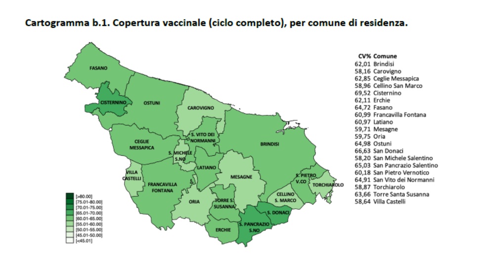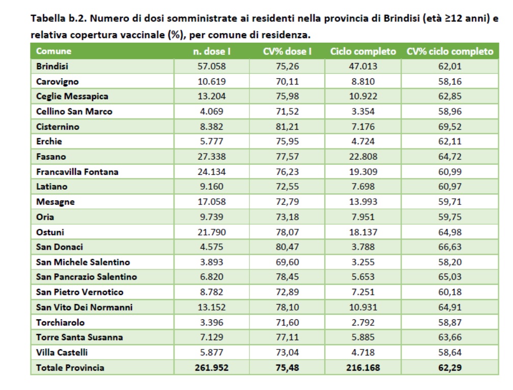 Per quanto riguarda il comune di Fasano, i dati del report dicono che sono 27.338 i fasanesi che hanno ricevuto la 1ª dose, (77,57%) e 22.808 quelli che hanno ricevuto il ciclo completo (64,72).