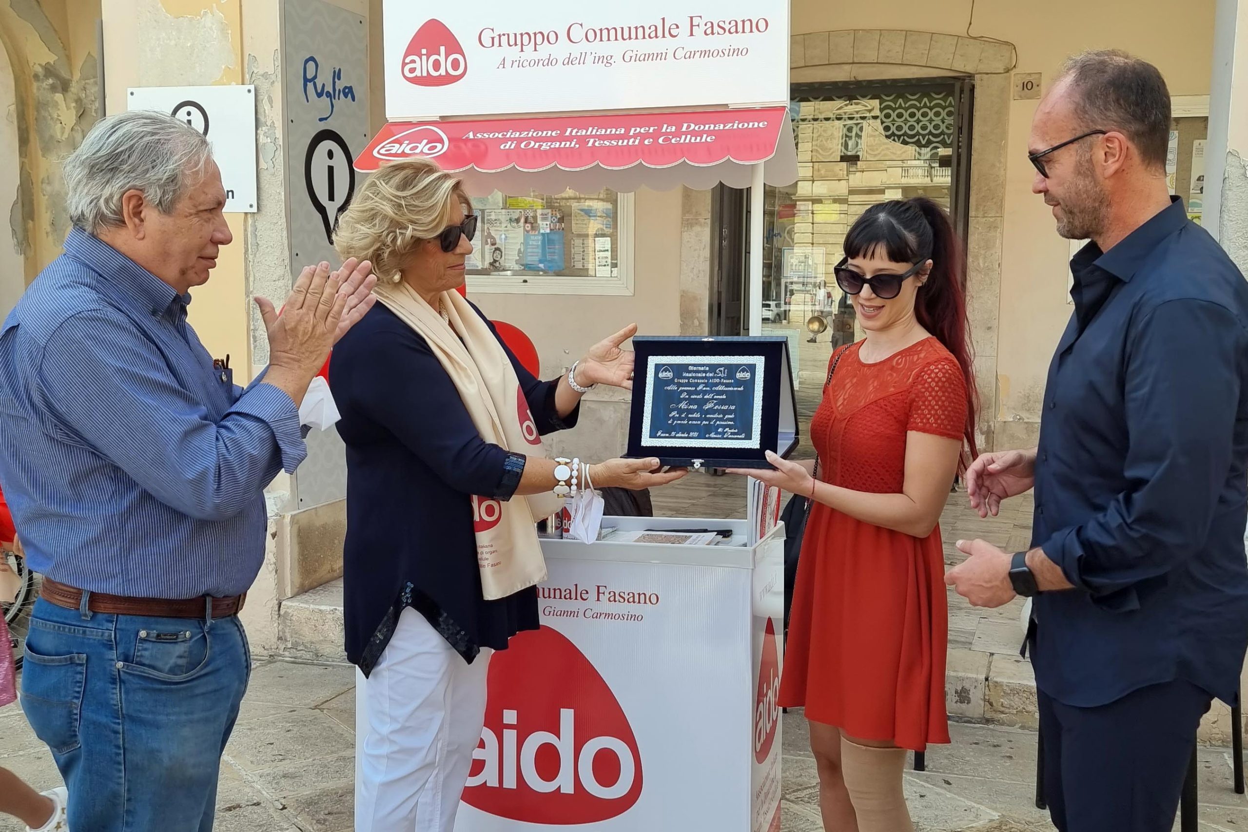 Fasano – Ieri, domenica 26 settembre, in occasione della Giornata Nazionale del Sì, organizzata dall'Aido nazionale, in Piazza Ciaia, è stata consegnata una targa alla famiglia Abbracciavento, in memoria della compianta Mina Ferrara, per il grande gesto di solidarietà umana espresso con la donazione degli organi.