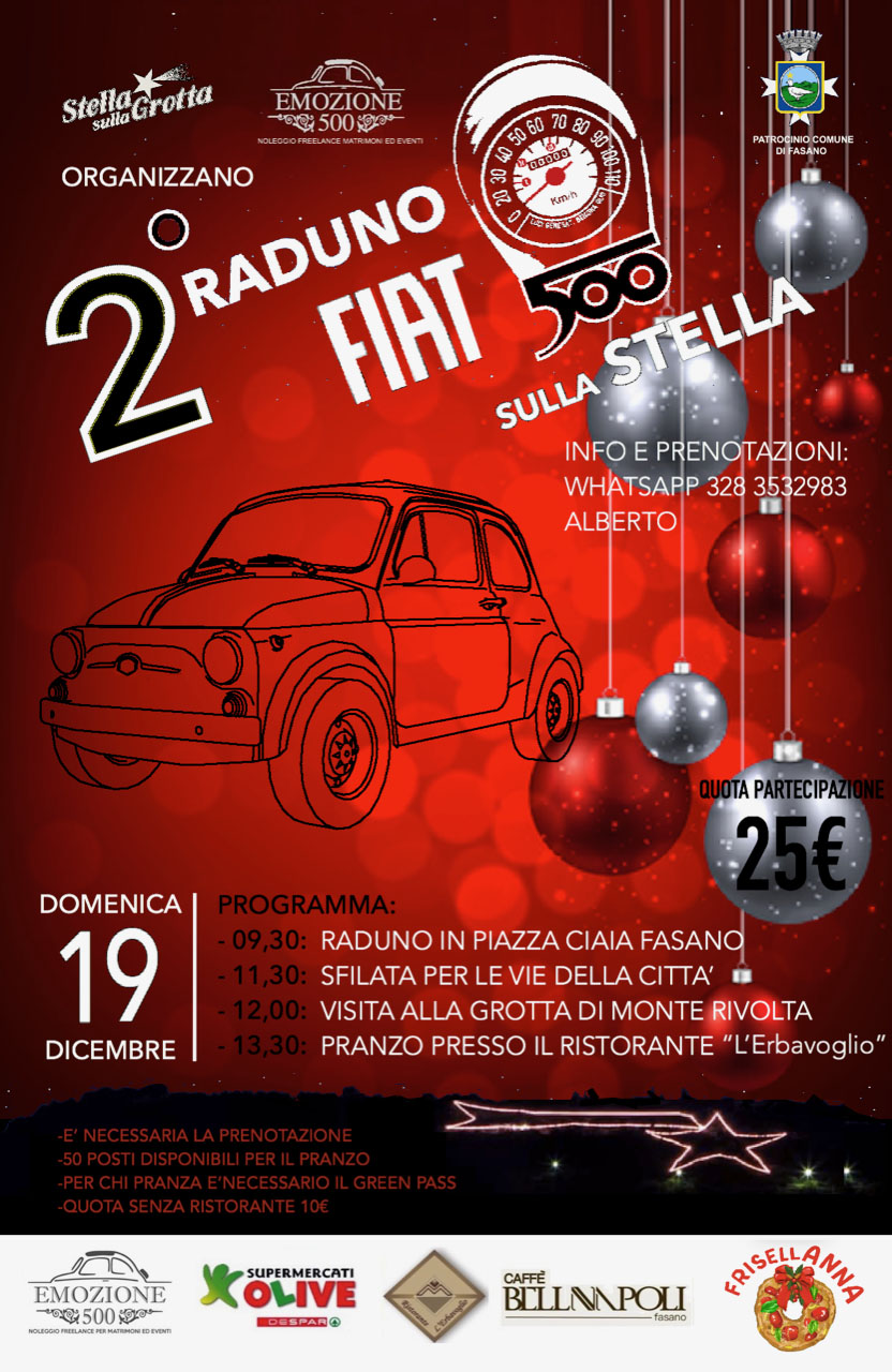 Fasano – Domenica 19 dicembre 2021 dalle ore 09:30, presso Piazza Ciaia in Fasano (BR), si terrà la seconda edizione del raduno “FIAT 500 SULLA STELLA”.