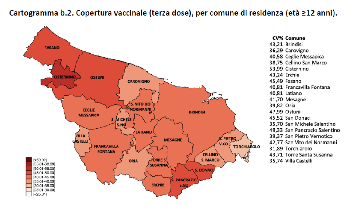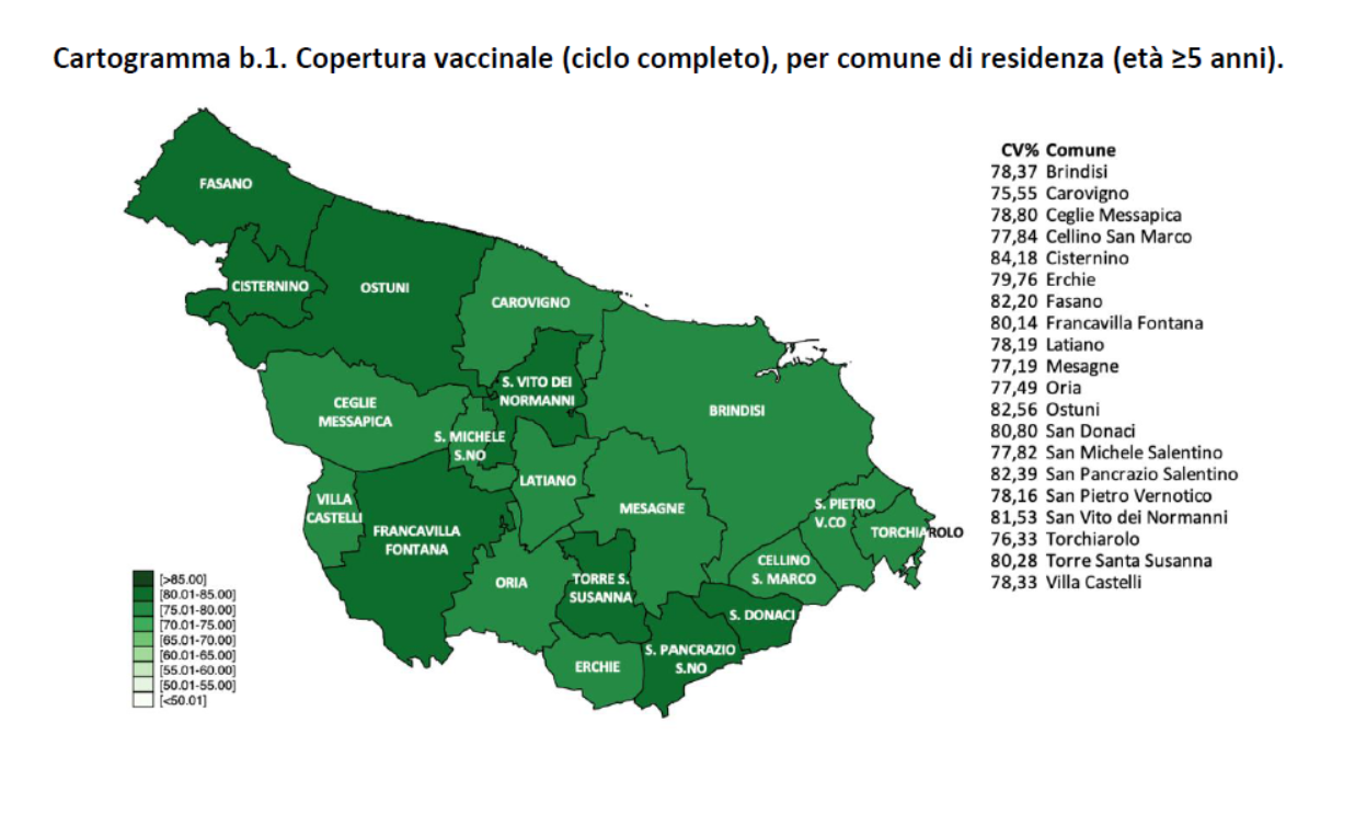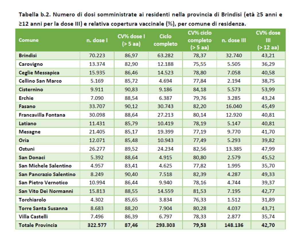 Fino al 6 gennaio i residenti o domiciliati in provincia di Brindisi vaccinati con la prima dose sono 314.758, di questi 293.180 con la seconda dose e 148.136 con la terza dose, con una copertura vaccinale pari rispettivamente al 90,7%, all'84,5% e al 42,7%. La copertura vaccinale con la prima dose relativa ai residenti con più di 80 anni di età è pari al 97,7%, al 94,9% per il ciclo completo e al 75% per la terza dose.
