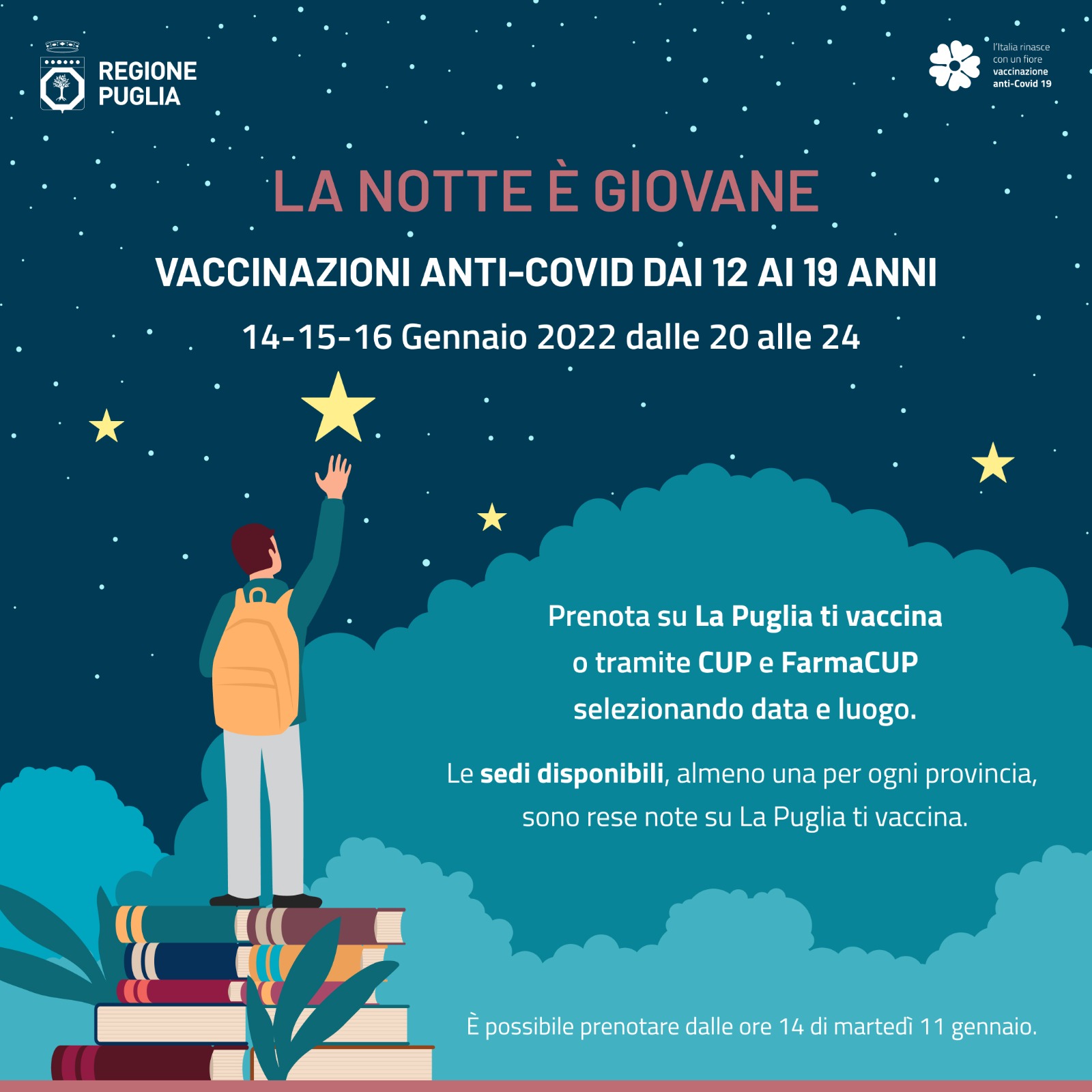 Lo dichiara il presidente della Regione Puglia Michele Emiliano nell’annunciare l’iniziativa regionale “La notte è giovane”, tre notti dedicate alla vaccinazione dei pugliesi di 12-19 anni, in programma il 14-15-16 gennaio, dalle ore 20 alle 24, nei principali hub vaccinali della regione.