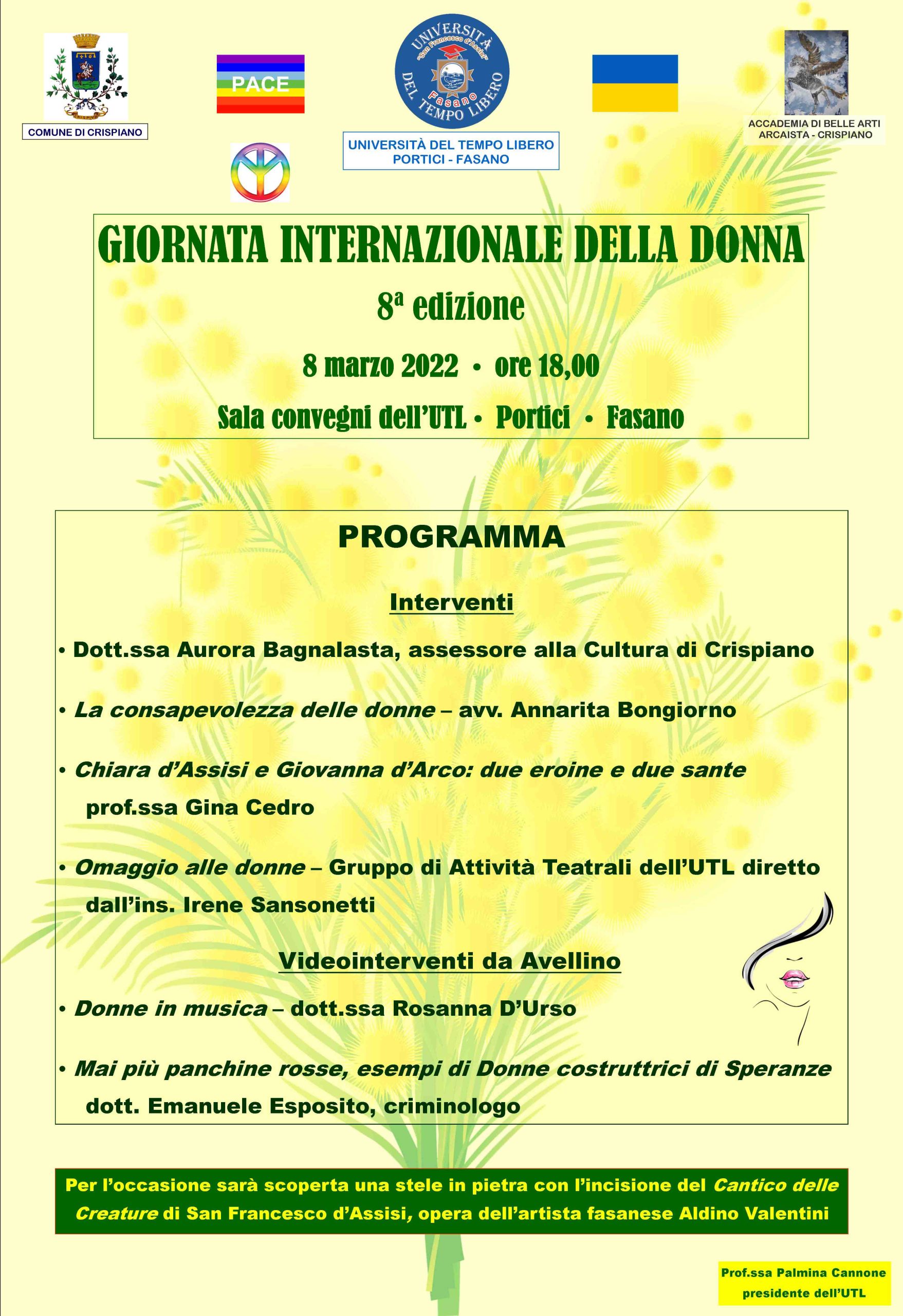 Il programma della serata s’incentra sulla tematica afferente il ruolo della donna in alcuni periodi storici, col pensiero rivolto alle donne ucraine che fuggono dalla guerra con i loro figli.  «Il convegno – sottolinea la presidente Palmina Cannone – è il proseguimento degli approfondimenti  analizzati nei Corsi sui Diritti umani che ogni giorno vediamo essere calpestati. Parlo dei diritti dei fanciulli, degli uomini, della famiglia, dei popoli, dei diversi, delle minoranze, non solo delle donne. Diritti sacrosanti che menti folli ghigliottinano in nome del nazionalismo, dell’imperialismo, della superiorità della razza, di egoismi e amori malati. La storia non ci ha insegnato nulla, perché seguitiamo nella nostra ottusa arroganza. Di queste problematiche occorre parlare sempre perché si continui a educare alla Pace». Dopo l’intervento della dott.ssa Aurora Bagnalasta, l’avv. Annarita Bongiorno argomenterà La consapevolezza delle donne, soffermandosi su Santa Ildegarda, Artemisia Gentileschi e una donna della Resistenza. A seguire, la prof.ssa Gina Cedro disserterà su Chiara d’Assisi e Giovanna d’Arco: due eroine e due sante. Ancora in scaletta: Omaggio alle donne, a cura del Gruppo di Attività Teatrali dell’UTL (Pasquina Calandrella, Grazia Cucci, Domenico Mileti, Laura Pantaleo e Pasquina Pantaleo) diretto dall’ins. Irene Sansonetti. Interverranno da Avellino con dei video: la sociologa, dott.ssa Rosanna D’Urso che illustrerà Donne in musica; e il criminologo, dott. Emanuele Esposito che esporrà: Mai più panchine rosse, esempi di Donne costruttrici di Speranze.