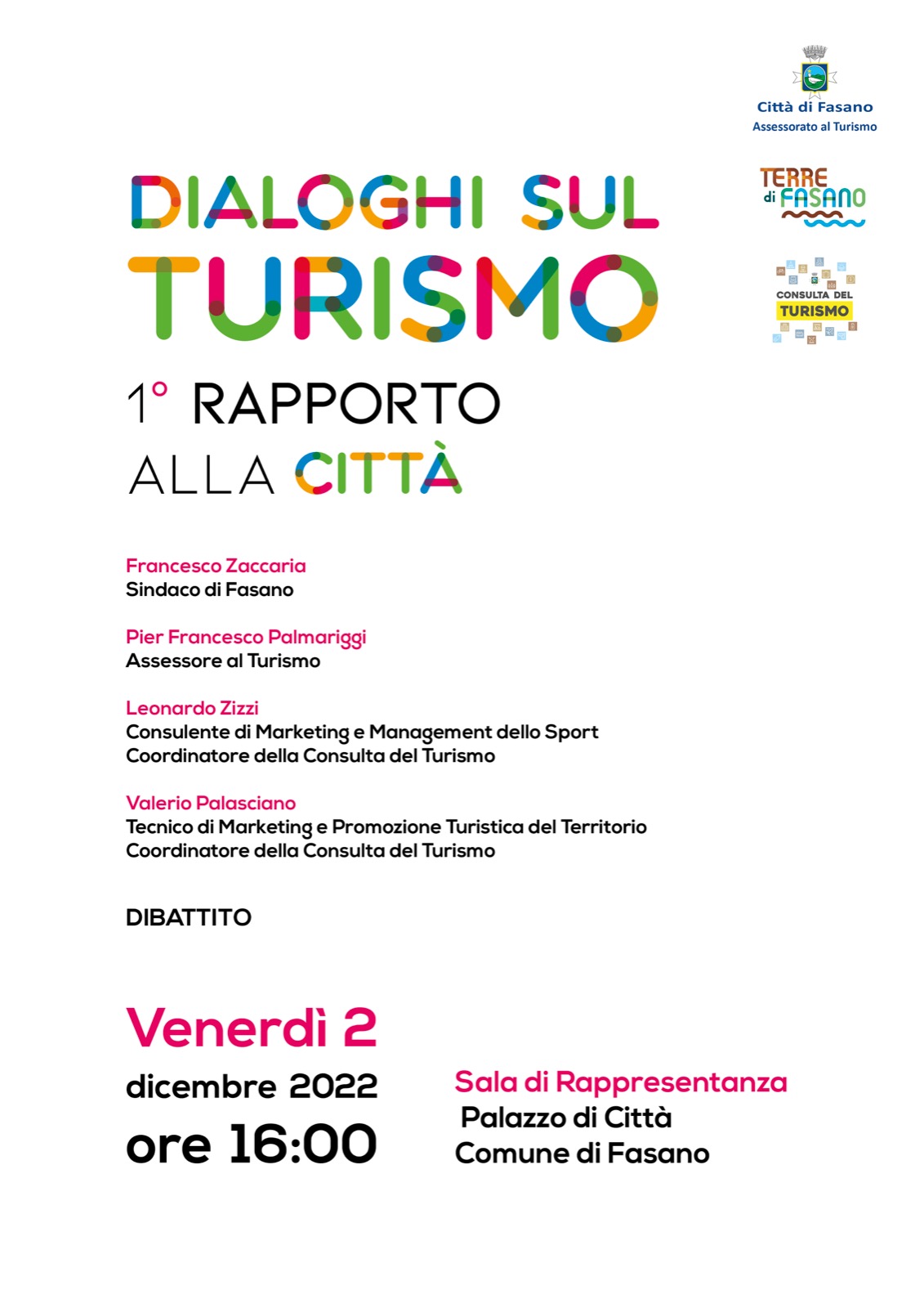 FASANO – Si svolgerà venerdì 2 dicembre alle ore 16.00 presso la Sala di Rappresentanza del Palazzo di Città, l’evento pubblico «Dialoghi sul Turismo – 1° Rapporto alla Città».