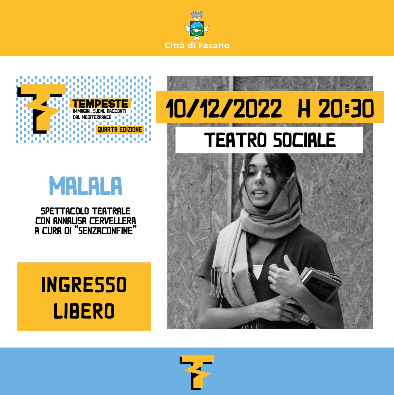 Oggi 10 dicembre alle 20:30 appuntamento al Teatro Sociale con il monologo «Malala» di Annalisa Cervellera cura della compagnia SenzaConfine di David Marzi e Teresa Cecere.