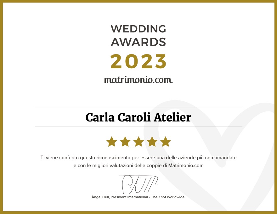Quest'anno, inoltre, vogliono essere un omaggio a tutto il settore per il duro lavoro svolto. Uno di questi premi è stato assegnato a Carla Caroli Atelier nella categoria Sposa e accessori. Carla Caroli Atelier, ha ottenuto un totale di 32 recensioni nella vetrina digitale pubblicata sul sito Matrimonio.com e un punteggio di 5.0 su 5.0 assegnato dalle coppie che hanno usufruito dei suoi servizi per il loro matrimonio. Da oggi è anche visibile nel suo profilo su Matrimonio.com il bollino che ne riconosce la vincita di un Wedding Award 2023, un premio più che meritato e che include l'azienda tra le migliori del settore wedding in Italia, con un valore significativo per le coppie impegnate nei preparativi di nozze, in quanto rappresenta una garanzia e può fare la differenza nella scelta dei fornitori.
