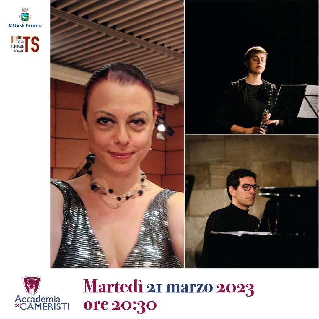Fasano – Nuovo concerto dell'Accademia dei Cameristi al Teatro Sociale di Fasano per la rassegna promossa dall’amministrazione comunale. Martedì 21 marzo alle ore 20.30 al Teatro Sociale di Fasano si esibirà un trio composto da musicisti di generazioni diverse: Valentina Coladonato, soprano dalla prestigiosa carriera – è stata diretta tra gli altri da Riccardo Muti, Roberto Abbado, John Axelrod – e Umberto Jacopo Laureti e Marta Nizzardo, giovani di talento, lanciati verso una piena realizzazione professionale.