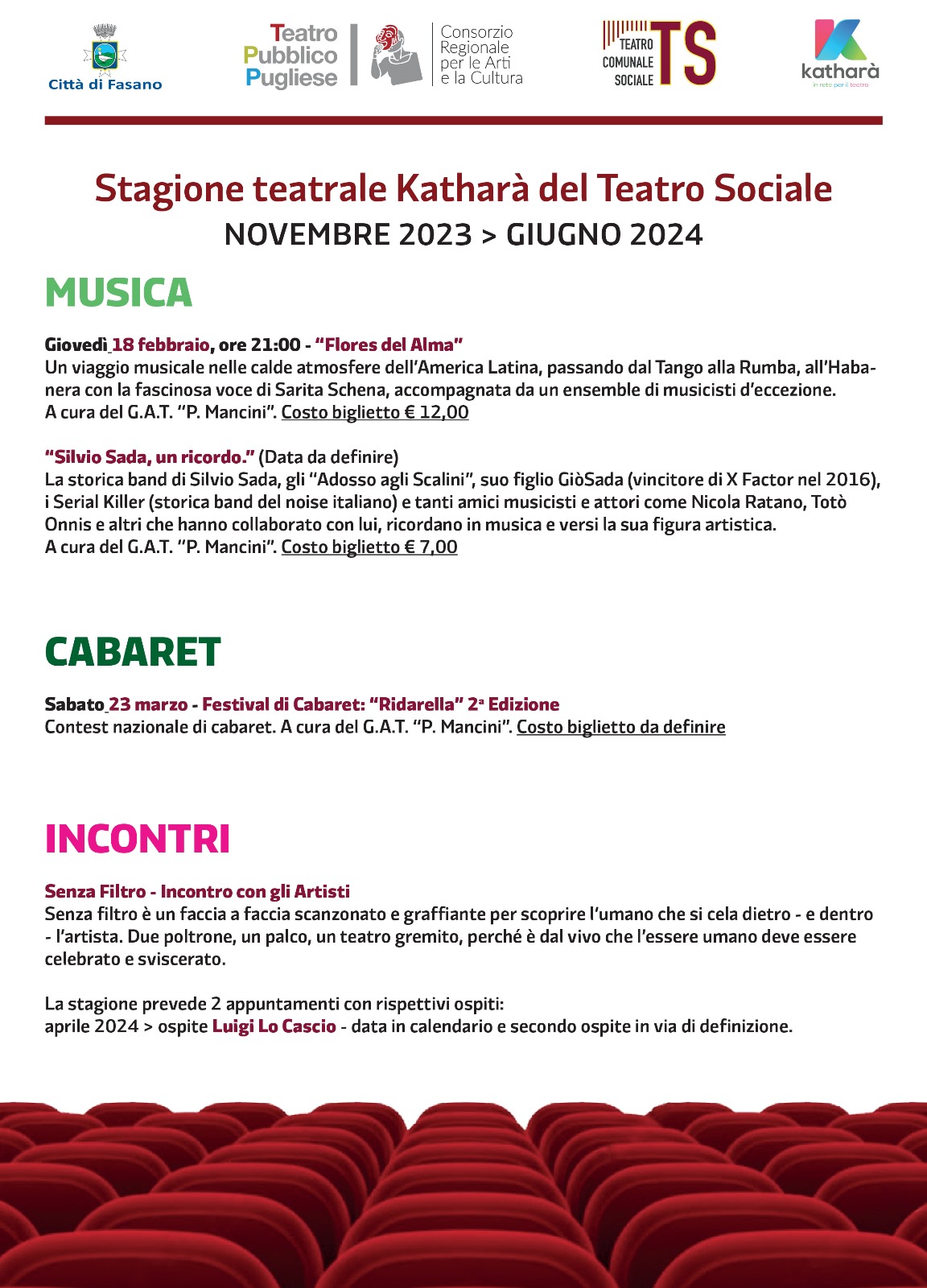 Da novembre 2023 a giugno 2024, il contenitore culturale della città di Fasano prenderà ancora vita con spettacoli di prosa, musical, danza, non mancheranno le attività laboratoriali rivolte ad aspiranti attori e tecnici di palcoscenico che, oltre a coinvolgere gli studenti, abbracceranno tutti coloro che intendano misurarsi con nuove esperienze di socializzazione e consapevolezza di sé.