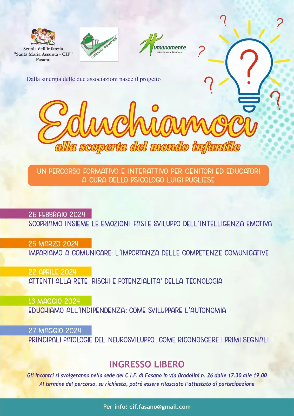 Fasano – Oggi educare è sempre più complesso. Per questa ragione, dalla sinergia delle associazioni C.I.F. di Fasano e Humanamente, nasce “Educhiamoci – alla scoperta del mondo infantile”. Un percorso formativo rivolto ai genitori e agli educatori in generale per conoscere e scoprire alcuni meccanismi che riguardano i processi evolutivi, comportamentali ed emotivi dei bambini.