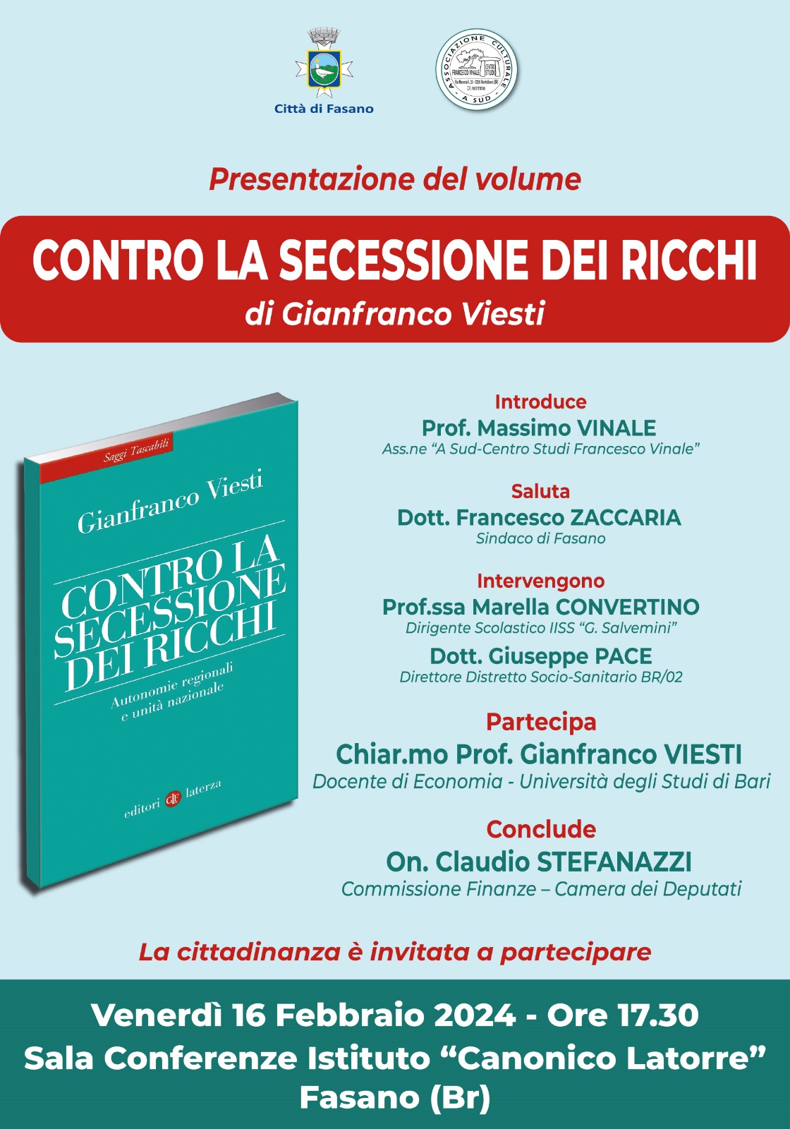 Fasano – Si terrà venerdì 16 febbraio, c.m., alle ore 17,30, presso la Sala Conferenze dell’Istituto “Canonico Latorre”, la presentazione del libro di Gianfranco Viesti “Contro la secessione dei ricchi” (Laterza Editore 2023). Promossa dall’associazione “A Sud-Centro Studi Francesco Vinale”, l’iniziativa è ascrivibile all’impegno civile e culturale che il sodalizio di via Maroncelli porta avanti da oltre 10 anni; da quando, cioè, partecipò alla pubblicazione del volume “La Nuova Questione Meridionale – Federalismo Fiscale e Diritti di Cittadinanza” di Massimo Vinale (Edizioni Ventrella 2012).