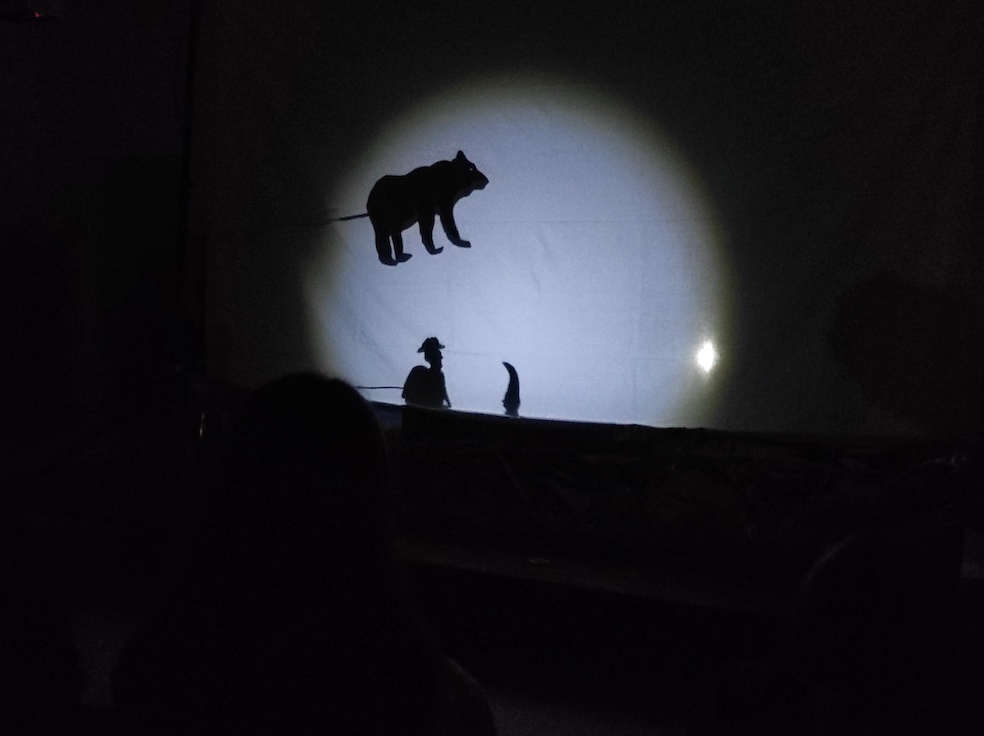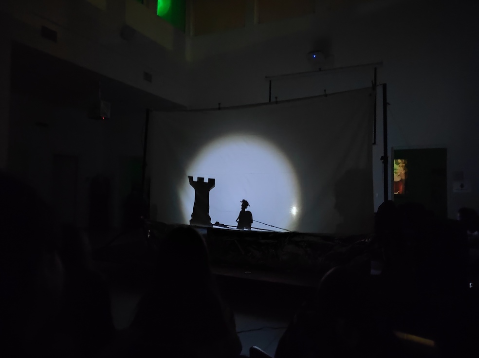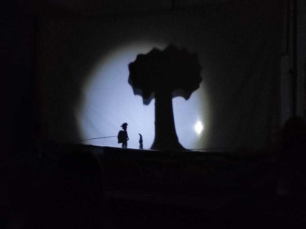 Su una tela bianca, con una luce a illuminarla al centro, la storia d’avventure di Ildeprando ha preso la forma delle ombre, marionette che si muovevano e davano l’illusione di essere grandissime o piccolissime.