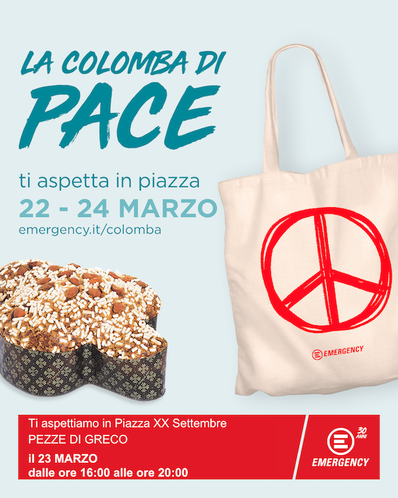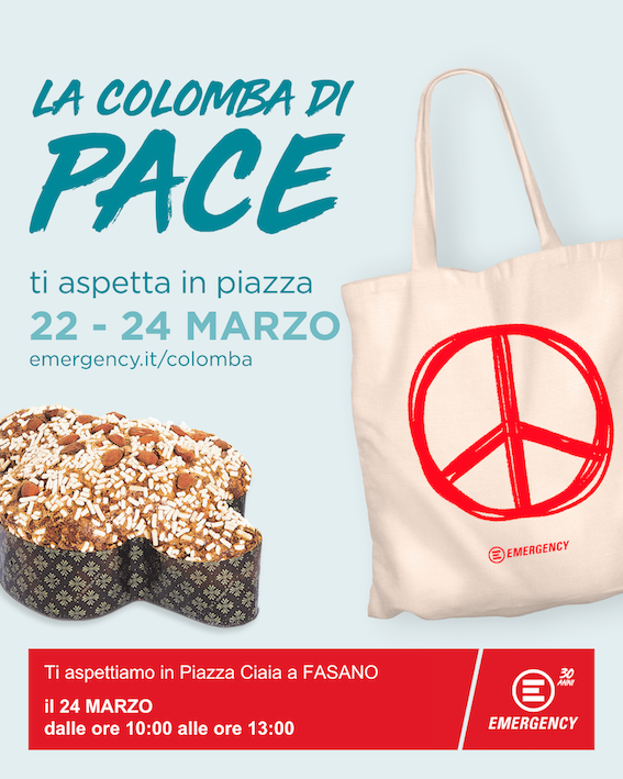 Fasano – Sabato 23 e domenica 24 marzo EMERGENCY sarà presente a Fasano, a Pezze di Greco e in oltre 200 piazze italiane con la sua “Colomba di Pace”. L’iniziativa è pensata per chi vuole donare un simbolo di pace ad amici e familiari o farsi un regalo in occasione delle festività pasquali sostenendo l’impegno di EMERGENCY per il diritto alla cura e i suoi ospedali e ambulatori in Italia e nei Paesi in cui opera come Afghanistan, Eritrea, Iraq, Sierra Leone, Sudan, Uganda.