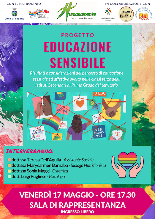Fasano – In occasione dell’iniziativa comunale O-maggio all’infanzia e della Giornata Mondiale contro l’omofobia, transfobia e bifobia, l’Associazione Humanamente ha organizzato un incontro pubblico di presentazione dei risultati e delle considerazioni del percorso di educazione sessuale ed affettiva svolto nelle classi terza degli Istituti Secondari di Primo Grado del territorio comunale.