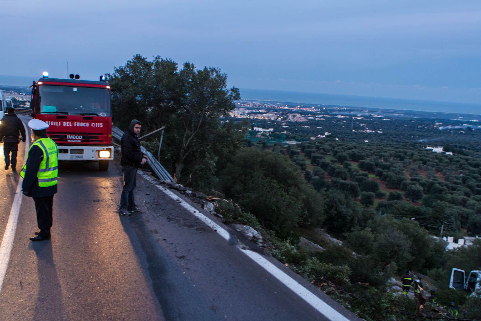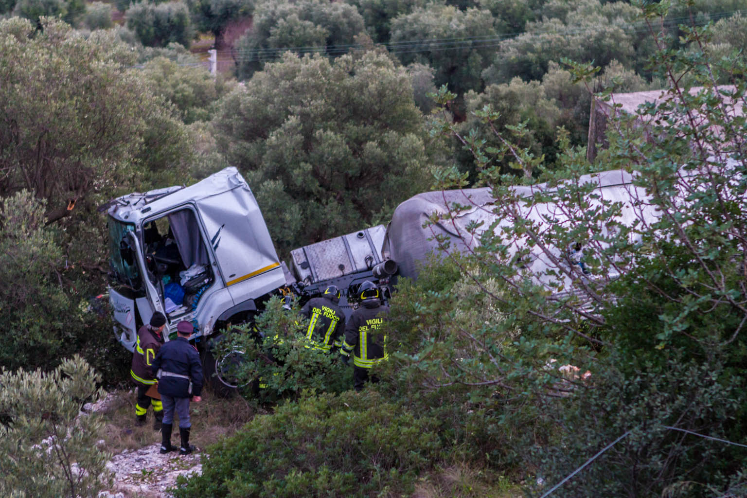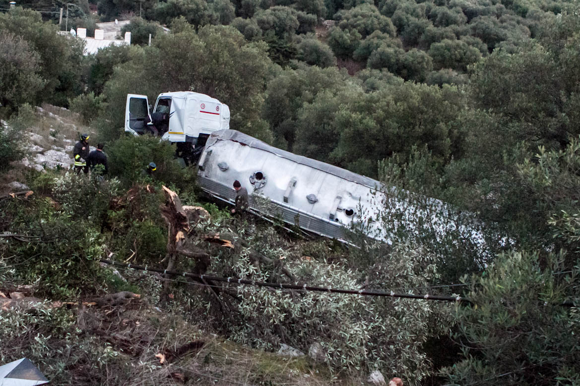 Un incidente dunque che poteva comunque avere ben altre conseguenze. Erano le 17 quando, per cause ancora in fase di accertamento. L’autocisterna, partita da Taranto e carica di gasolio, è precipitata nella scarpata subito dopo la Madonnina. L’autista, un uomo di Bari, ha perso il controllo del mezzo finendo nel dirupo e, rotolando, ha fermato la sua corsa decine di metri più in basso rispetto alla carreggiata. Nell’impatto il pesante mezzo ha letteralmente strappato una cinquantina di metri di guard-rail, divelto alberi di ulivo e spezzato pali della linea telefonica. Per fortuna il camionista è uscito pressoché incolume dall’incredibile sinistro. Infatti è risalito da solo verso la statale anche se poi si è fatto accompagnare da un’ambulanza del 118 al Perrino di Brindisi per accertamenti. Sul posto sono prontamente intervenute alcune pattuglie della Guardia di Finanza, della Polstrada e della Polizia municipale di Fasano che hanno provveduto ai rilievi e alla viabilità dato che il tratto dove è avvenuto l’incidente è tra i più stretti dell’arteria che collega Fasano a Laureto. In pochi minuti è anche sopraggiunto un mezzo dei vigili del fuoco. Data l’alta pericolosità del carico hanno innanzi tutto messo in sicurezza la zona e poi hanno cominciato la fase di scarico e di travaso del combustibile dalla cisterna terminata a tardissima notte. Secondo le prime testimonianze raccolte sul posto sembra che la cisterna, a causa dell’asfalto viscido per l’umidità, abbia perso aderenza e sia finita fuori strada portando con se, a causa del suo grande peso, anche la cabina dell’autista. Il punto dell’incidente di ieri è già stato teatro di un altro incidente ma di ben più gravi conseguenze.