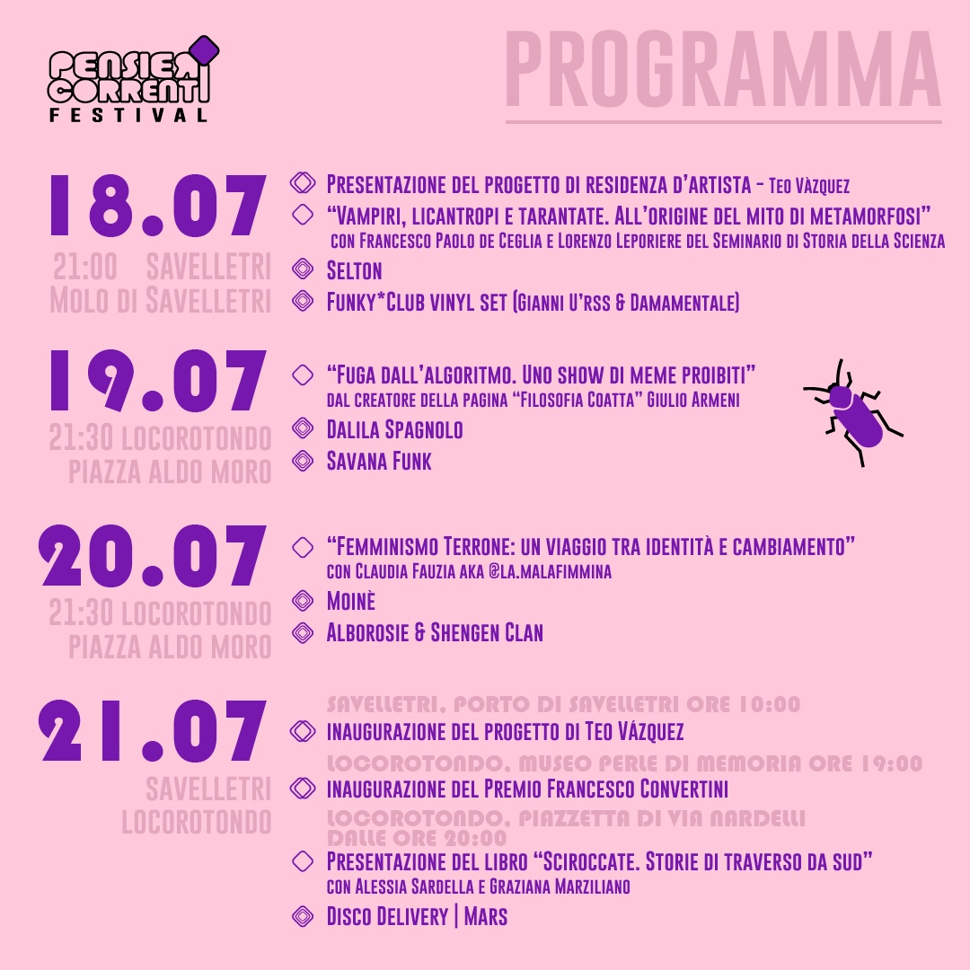Giovedì 18 luglio si apre alle ore 21:00 presso il Molo di Savelletri di Fasano, con la presentazione del documentario del progetto di residenza di Teo Vàzquez, artista spagnolo specializzato in interventi di arte urbana: un murales site-specific, nato anche grazie al contributo del Comune di Fasano, che restituirà una visione identitaria del territorio scaturita da un processo di condivisione con la comunità. A seguire Francesco Paolo de Ceglia e Lorenzo Leporiere del Seminario di Storia della Scienza, il centro interuniversitario di ricerca con sede presso l'Ateneo di Bari, guidano il talk “Vampiri, licantropi e tarantate. All'origine del mito di metamorfosi”.