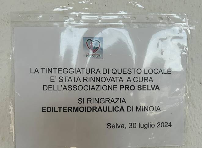 «L’Ass. Pro Selva, che come esplicita molto bene il nome opera per la tutela di interessi collettivi dei residenti e dei visitatori della zona di territorio comunale denominata Selva di Fasano in tutti i suoi siti, anche questa volta ha favorevolmente colpito e stupito per l’attività svolta sulla struttura che ospita l’ufficio postale della frazione, di proprietà del Comune.