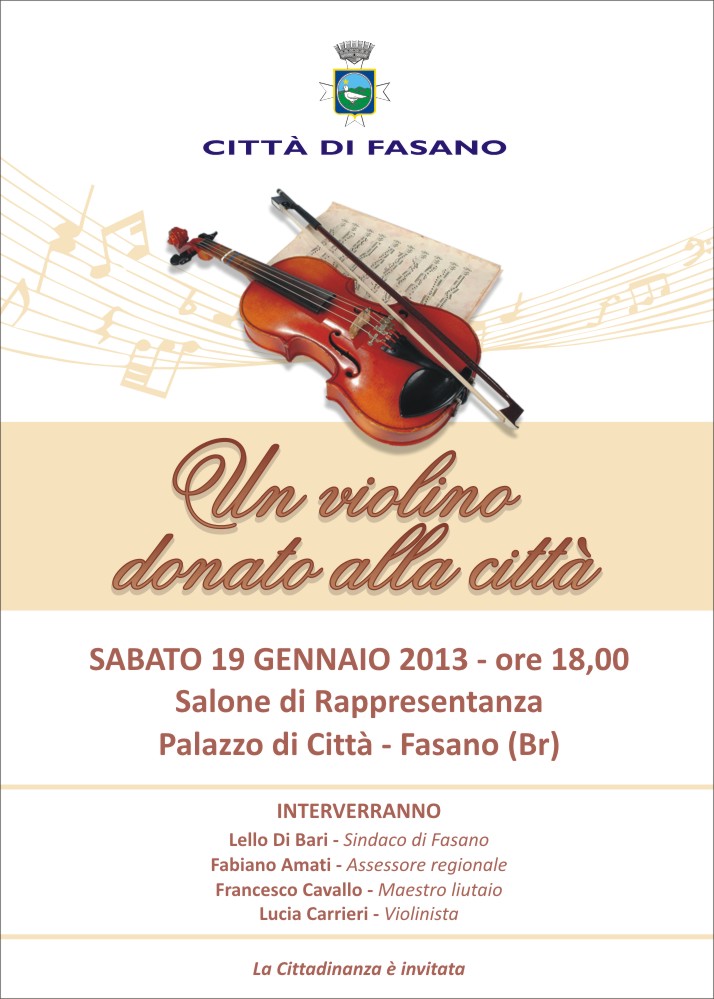 La manifestazione è stata organizzata dal Comune di Fasano. «Ho voluto che la consegna potesse avvenire in una pubblica manifestazione, poiché la cerimonia vuole essere anche un tributo della città ad un grande artigiano fasanese, come il maestro Cavallo – afferma il sindaco Di Bari – che con la sua raffinata arte da liutaio rappresenta una delle eccellenze fasanesi nel mondo dell’artigianato non solo locale ma anche pugliese. Sarò onorato di ricevere, simbolicamente a nome di tutta la città, dalle mani del maestro Cavallo – sottolinea il sindaco – il violino cesellato con infaticabile bravura dal signor Francesco, uno delle decine di pezzi che il maestro Cavallo ha realizzato nella sua lunga carriera».