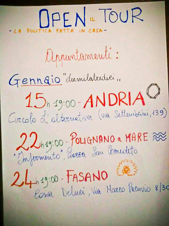 Domani, giovedì 24 gennaio, il tour di OPEN fa tappa a Fasano. Alle 19 aprirà le porte della sua casa il musicista e compositore locale Vincenzo Deluci (via Marco Pacuvio 8/30). OPEN, infatti, intende abbattere la barriera che troppo a lungo ha separato la realtà dagli spazi privati. La crisi della politica è cominciata quando è stata espulsa dalle nostre case. Far diventare gli ambienti domestici luoghi di socializzazione della politica è il cortocircuito con cui OPEN vuole riconciliare la politica alla vita di ogni giorno.