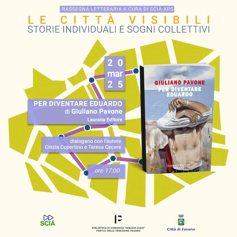 FASANO – Sarà lo scrittore Giuliano Pavone l’ospite del prossimo appuntamento della rassegna letteraria “Le città visibili. Storie individuali e sogni collettivi” promossa dall’associazione SCIA’ APS con il Patrocinio del Comune di Fasano – Assessorato alla Cultura presso la nuova Biblioteca di Comunità “I Portici – Ignazio Ciaia”.