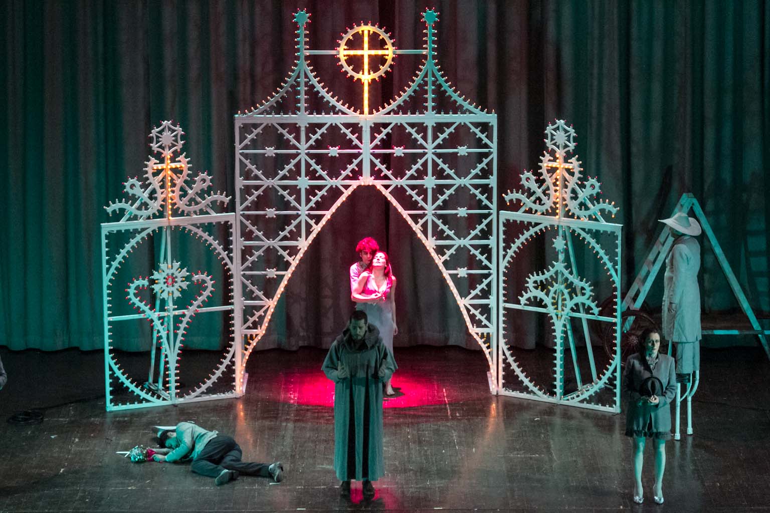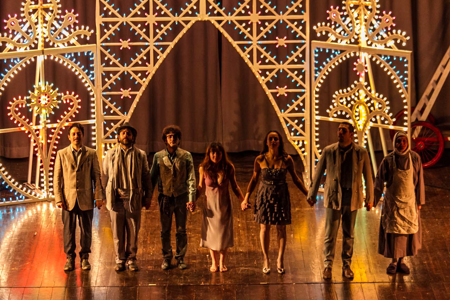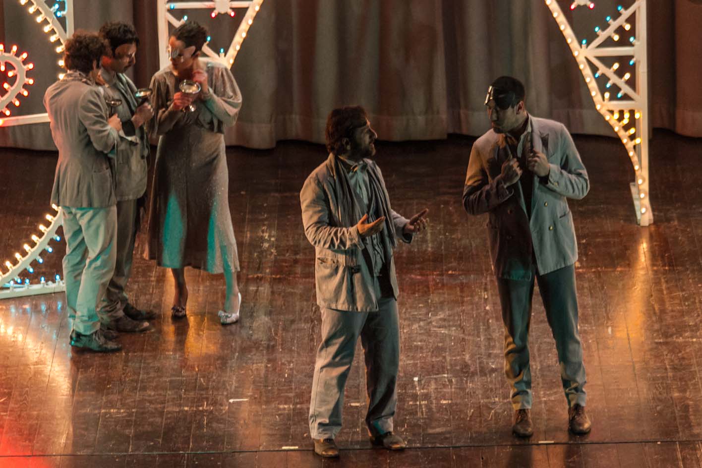 FASANO – Cosa c’entrano “Fiesta” di Raffaella Carrà o “Il carrozzone” di Renato Zero con William Shakespeare? All’unanimità diremmo tutti un bel niente. Almeno fino a quando non si assiste al nuovo adattamento di “Romeo e Giulietta” di Francesco Niccolini e portato, sotto la regia di Tonio De Nitto, in scena ieri sera (venerdì 25 gennaio), al Teatro Kennedy, nell’ambito della stagione teatrale, dalla compagnia Transadriatica. Sette gli attori tra cui il fasanese Fabio Tinella. Una rappresentazione fuori dai canoni che oltre alla originale scelta musicale affianca anche delle luminarie da festa patronale a sottolineare i vari quadri. Il testo di Shakespeare ne esce stravolto con i dialoghi non in rima ma in prosa. «Tutto è gioco – spiega lo stesso Niccolini -, tutto è capriccio, il ritmo e il tono scherzosi, la storia spesso comica, fino a prova contraria, fino al sangue versato, fino a un padre che dà della puttana alla figlia, fino alla morte dei compagni di gioco, fino al rimpianto più feroce e alla colpa. Come nel più classico dei casi da tragedia, la colpa dei padri, che, come scrive Pasolini, deve essere gravissima per meritare una così atroce punizione. Ed è questo il motivo per cui amo tanto Romeo e Giulietta: perché racconta la colpa più grave in assoluto di cui noi essere umani ci macchiamo e subiamo allo stesso tempo, la soppressione dell'infanzia e dell'adolescenza. Una soppressione che tutti piangono, perché tutti siamo stati ragazzi e poi tutto è finito».