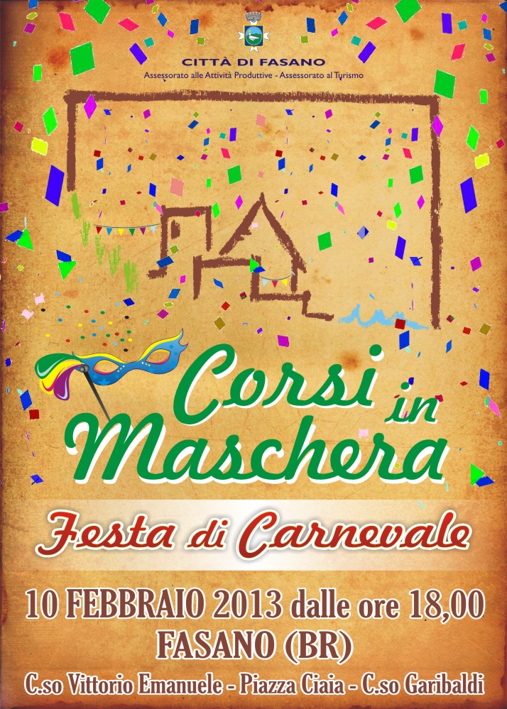 “Festa di Carnevale - Corsi in maschera” è la kermesse organizzata dal Comune di Fasano per domenica 10 febbraio a partire dalle ore 18 nel centro cittadino.
