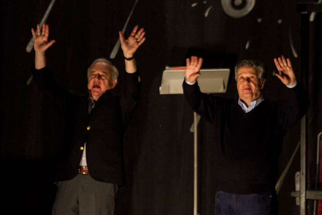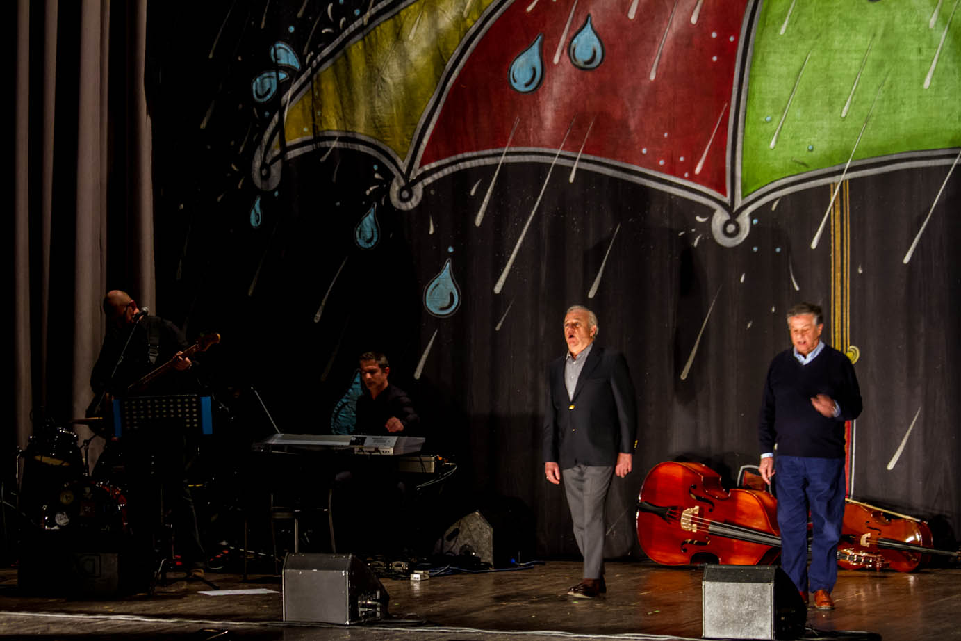 Un gigantesco ombrello colorato sullo sfondo, una band di musicisti, due uomini dall’accento milanese: si è aperto così lo spettacolo di «canzoni e ragionamenti» che per due ore ha riportato alla ribalta Cochi e Renato, ovvero «quelli che nel ’63 hanno inventato il cabaret», come essi stessi si sono definiti.