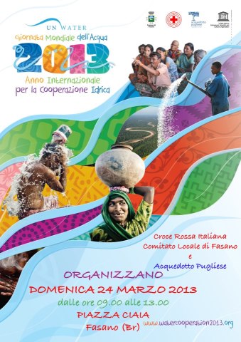 FASANO – Si svolgerà domani (domenica 24 marzo), in piazza Ciaia a Fasano una manifestazione pubblica rientrante nell’ambito delle iniziative internazionali della “Giornata mondiale dell’acque 2013 – Anno internazionale per la cooperazione idrica”. A Fasano il Comitato Locale Cri e l’Acquedotto pugliese hanno messo a punto una serie di iniziative che caratterizzeranno la mattinata. In particolari i “Giovani” della Cri fasanese svolgeranno un’attività di sensibilizzazione circa le tematiche ambientali, in quanto la Croce Rossa ha deciso di rendersi parte attiva nella Giornata Mondiale dell'Acqua promossa dalle Nazioni Unite che quest'anno è incentrata su un tema a noi molto caro: la cooperazione idrica.
