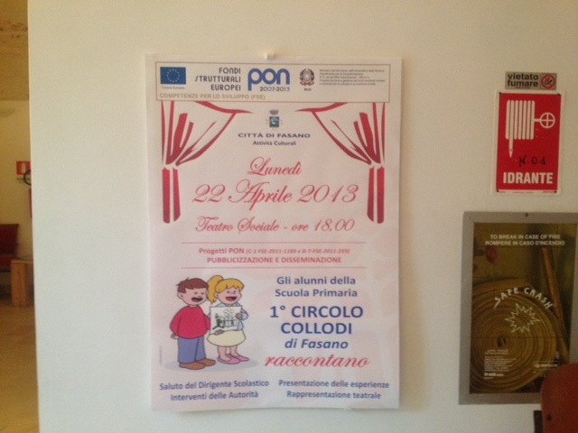 FASANO – Si sono conclusi, con un’apposita manifestazione tenutasi al Teatro Sociale di Fasano, I Pon relativi al biennio 2011-2012 e 2012-2013 della scuola Primaria del 1° Circolo didattico fasanese. E’ stata la dirigente Alma Narducci a spiegare nel dettaglio quanto fatto dai bambini in questi mesi grazie alla collaborazione di esperti esterni a seconda delle varie tematiche seguite.