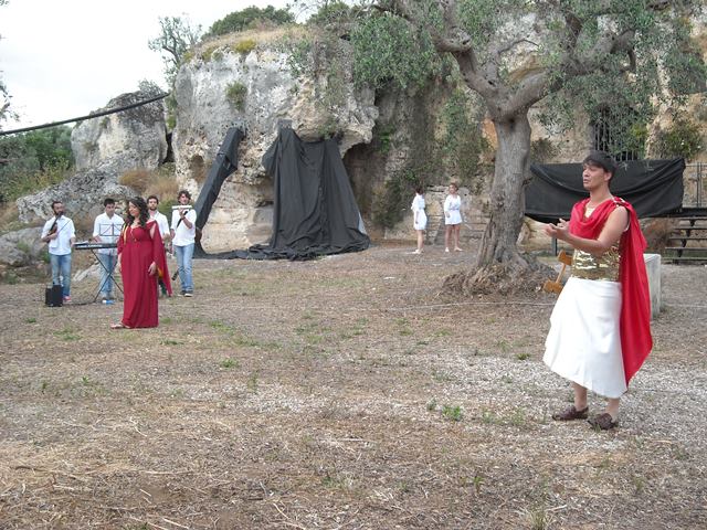 L’amore di Orfeo ed Euridice, topico nella tragedia greca, è stato rivisitato magistralmente dai liceali fasanesi, anche grazie all’accompagnamento musicale dei brani più celebri che raccontano il mito: in primis quelli di Carmen Consoli e Roberto Vecchioni. Lo scenario rupestre ha contribuito a rendere l’interpretazione ancora più elegiaca e commovente e l’idea del teatro itinerante ha sortito un effetto di compartecipazione del gremito pubblico agli avvicendamenti del giovane Orfeo nella sua ricerca d’amore.