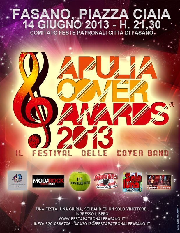 FASANO – “Apulia cover awards 2013” è il festival delle cover band organizzato, per domani (venerdì 14 giugno) alle ore 21 in piazza Ciaia, dal comitato “Feste patronali” con il patrocinio del Comune di Fasano nell’ambito della programmazione per i festeggiamenti dei santi patroni che si aprono proprio venerdì 14 per chiudersi lunedì 17 giugno. “Apulia cover awards 2013” è un pluri-concerto, presentato da Ketty Loconte e Martino Grassi, nel quale si esibiranno (per contendersi il titolo di miglior gruppo) sei band: “Zio Rufus band” (cover di Zucchero), “Rubiera blues” (cover di Ligabue), “42” (cover dei Coldplay), “Spirito libero” (cover band di Giorgia), “Nowhere men” (cover dei Beatles) e “Modarock” (cover dei Modà).