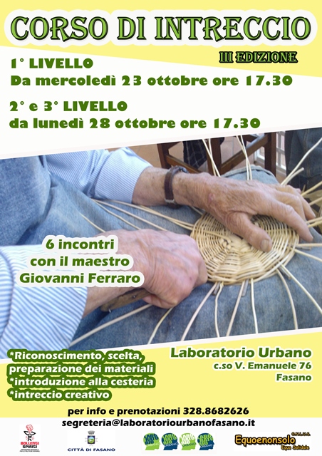 FASANO – Al Laboratorio Urbano di Fasano, dopo il grande successo dello scorso anno, riparte il corso d’intreccio tenuto dal maestro Giovanni Ferraro che con grande passione e dedizione trasmette le sue abilità manuali arricchite dalla riscoperta delle tradizioni. Intrecciando ramo dopo ramo si creeranno cesti capaci di sostenere pesi capaci di raccontare storie prima fra tutti il legame tra l’uomo e la natura.