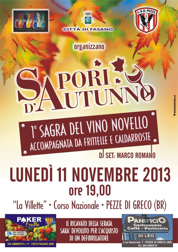 FASANO – Si terrà lunedì 11 novembre, a partire dalle ore 19 nella villetta di corso Nazionale a Pezze di Greco, la manifestazione "Sapori d'autunno" nel corso della quale si svolgerà la prima sagra del vino novello accompagnato da frittelle e caldarroste.