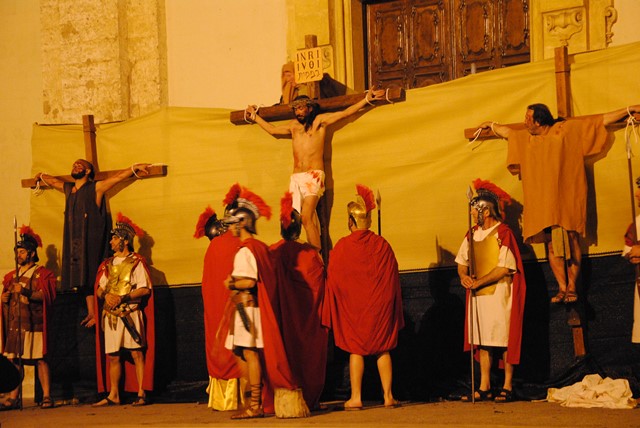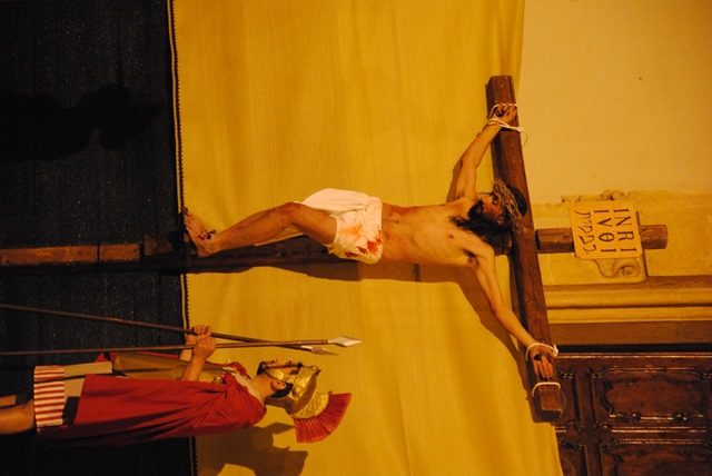 Per conferire veridicità alla recita Gesù, portando la croce in spalla e la corona di spine sul capo, ha simulato il suo percorso fino al Calvario percorrendo corso Vittorio Emanuele, piazza Ciaia, via Carlo Alberto e via s. Francesco fino a piazzale Aldo Moro (sul sagrato della chiesa di s. Francesco da Paola): il Cristo, frustato e maltrattato dai soldati romani, viene infine crocifisso assieme ai due ladroni.