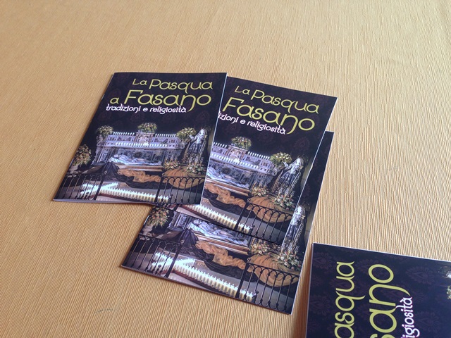 Margherita Latorre, dell’Ufficio comunale Turismo che ha curato i testi, ha annunciato che «il prossimo anno l’opuscolo verrà stampato anche in lingua inglese, per meglio veicolare le nostre iniziative pasquali tra i turisti». Interamente a colori ed in sole sette pagine, l’opuscolo alterna testi e foto sulle tradizioni pasquali, con gli “scatti” di Giuseppe Fanizza e di Gianfranco Mazzotta. Impostato in paragrafi, il libretto propone così tutte le sfaccettature, fra tradizioni popolari e religiosità, che si dipanano nel periodo pasquale vissuto a Fasano. Si parte col paragrafo “La Quaresima e le Quarantane” per proseguire con gli altri temi, “La Fiera”, “Il giovedì santo”, “Il venerdì santo”, “La focaccia con le cipolle o à fecazza chiàne” (espressione dialettale locale per indicare “la focaccia piena” del venerdì santo), “Il sabato santo e il canto di questua”, “La mattina di Pasqua”, “La Pasquetta dei fasanesi”. I paragrafi, singolarmente, illustrano le iniziative che si svolgono a Fasano durante il periodo pasquale: da quelle prettamente religiose (le celebrazioni delle messe e le processioni organizzate dalla varie Confraternite) a quelle della tradizione popolare, come le Quarantane (pupazzi realizzati in stoffa a dimensione umana appesi nelle vie del centro storico e rappresentanti una vecchia signora, moglie-vedova del Carnevale, vestita di nero e con in mano un’arancia nella quale sono conficcate 7 penne di gallina, cioè le 7 settimane di Quaresima, mentre al collo ha una collana di aglio per allontanare il malocchio e al braccio un cestino con olio e taralli, i prodotti-simbolo di Fasano).