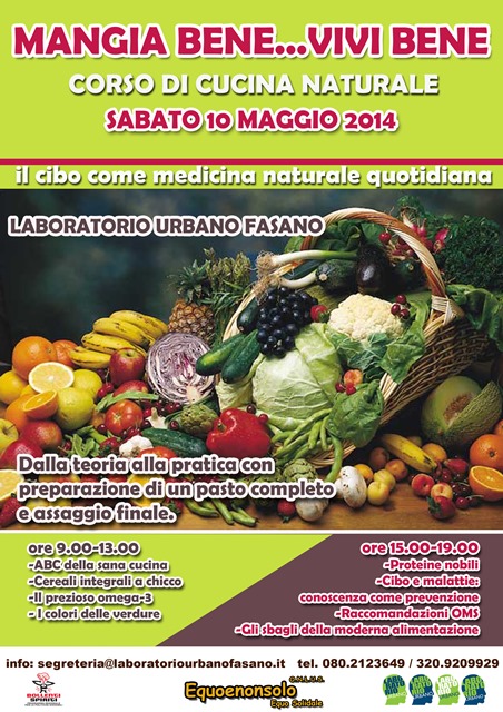 FASANO – Si deve al filosofo Feuerbach l’espressione «Noi siamo quello che mangiamo». È proprio così: ciò che ingeriamo, secondo diversi studi, definisce il fisico e anche la mente. Per imparare a preparare piatti gustosi ma salutari, al Laboratorio Urbano di Fasano si svolgerà sabato 10 maggio il corso di cucina naturale “Mangia bene…vivi bene. Il cibo come medicina naturale quotidiana”.