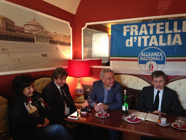 FASANO – "Occorre rivalutare la vera cultura di destra". Il verbo professato dall'ex sindaco di Roma Gianni Alemanno parte poprio da questa frase. L'esponente politico, candidato nella lista "Fratelli d'Italia – Nuova Alleanza Nazionale", ha incontrato questa mattina (giovedì 15 maggio), al Caffè Bella Napoli, i rappresentanti locali del partito e i simpatizzanti nel corso di un breve tour provinciale che sta toccando diverse cittadine brindisine. Alemanno, accompagnato da Michele Saccomanno, è stato ricevuto dalla portavoce fasanese di "Fratelli d'Italia" Lucia Buzzerio. Presenti anche i consiglieri comunali Grazia Neglia ed Enrico Digeronimo. Per un breve saluto è comparso all'incontro anche il sindaco Lello Di Bari.