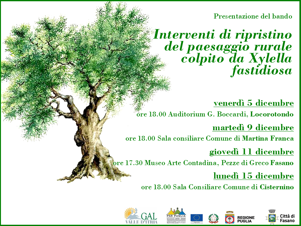 “La diffusione del batterio della Xylella Fastidiosa ha provocato in questi anni, secondo stime recenti, una perdita di redditività per il comparto olivicolo pugliese di oltre cento milioni di euro per anno- ha dichiarato il presidente del GAL Valle d’Itria, Giannicola D’Amico- Con questa misura il GAL intende sostenere fattivamente il comparto permettendo agli agricoltori di realizzare piccoli interventi di miglioramento e rifunzionalizzazione agricola e ambientale e consentendo, a beneficio del paesaggio della Valle d’Itria, un’attività di manutenzione, tutela e salvaguardia della biodiversità”.