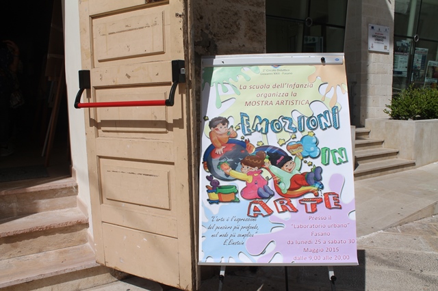 FASANO – E' stata inaugurata ieri mattina (lunedì 25 maggio), al Laboratorio Urbano di Fasano, la mostra artistica “Emozioni in arte” allestita dai plessi della scuola dell’Infanzia del 2° Circolo Didattico Giovanni XXIII di Fasano. E' stato l'assessore alla pubblica istruzione Renzo De Leonardis, insieme alla dirigente Federica Celeste Gennari, a tagliare il nastro di un'iniziativa nata a seguito del progetto “Piccoli Artisti” ideato da alcune insegnanti per i bambini dell’ultimo anno.