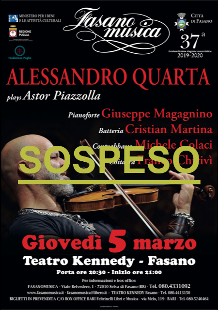 "Si informa il gentile pubblico che il concerto di questa sera,del violinista Alessandro Quarta,così come tutta l’attività di Fasanomusica e’ sospesa sino al 3 aprile,ai sensi del DPCM 4 marzo 2020,sulle misure per il contrasto e il contenimento sull’intero territorio nazionale del diffondersi del virus COVID-19".
