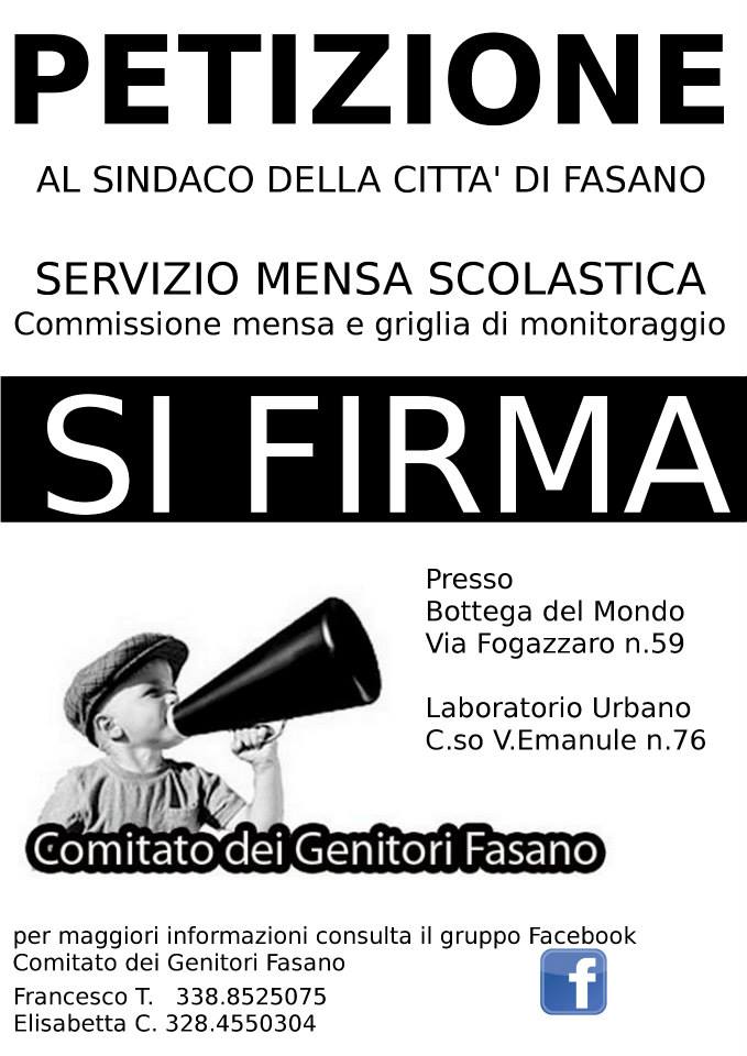 Questo il testo integrale della petizione: "A seguito della completa inattività per circa due anni della Commissione Mensa del nostro Comune, tornata a riunirsi soltanto dopo l’azione del Comitato nel dicembre scorso a cui è seguita solamente una visita di controllo presso il plesso S. Francesco e alla luce dell’evidente inadeguatezza del monitoraggio del servizio mensa della scuola dell’infanzia del Comune di Fasano, i sottoscritti titolari dei diritti di partecipazione rivolgono, in rappresentanza del Comitato dei Genitori Fasano, ai sensi dell'art. 12 dello statuto della Città di Fasano, la seguente petizione: – nomina di un rappresentante del Comitato dei Genitori Fasano a membro effettivo della Commissione Mensa del Comune di Fasano, con modifica, in tal senso, della Deliberazione di Giunta municipale n. 295 del 22 novembre del 2007; – introduzione nel prossimo bando di gara, in fase di pubblicazione, per l’assegnazione del servizio mensa scolastica per i prossimi cinque anni più due, di un’azione di monitoraggio interna dello stesso servizio, attraverso una griglia di valutazione che le insegnanti compileranno quotidianamente. Ciò al fine di garantire una valutazione costante del servizio, elaborata secondo criteri obiettivi che non possano dipendere da fattori di gusto personale, a completa tutela della salute dei nostri figli".