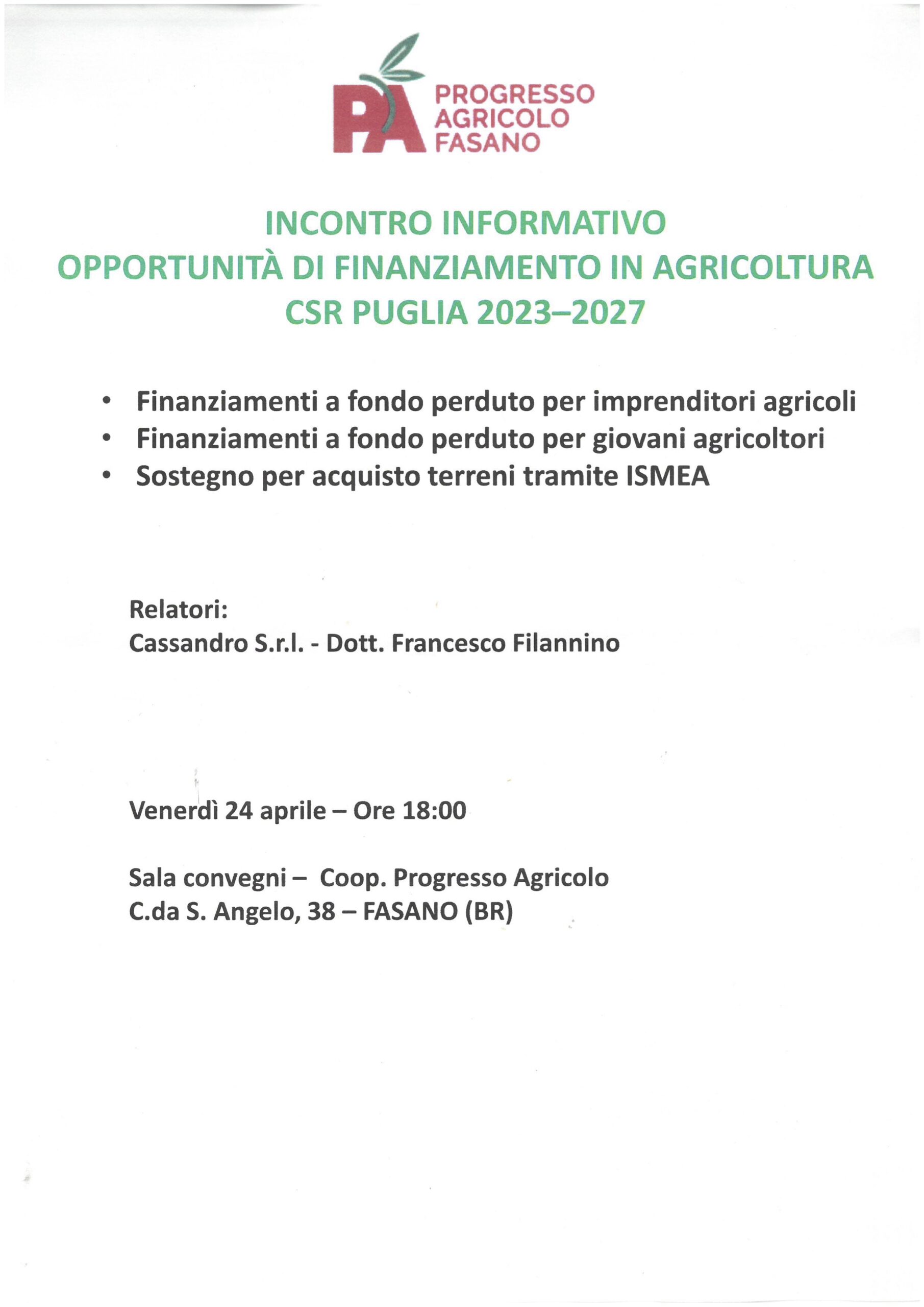 Fasano – La Cooperativa Progresso comunica che nell’ambito del CSR PUGLIA 2023/2027, è in prossima uscita un nuovo bando di finanziamento dedicato alle aziende agricole, caratterizzato da contributi a fondo perduto minimo del 60%.