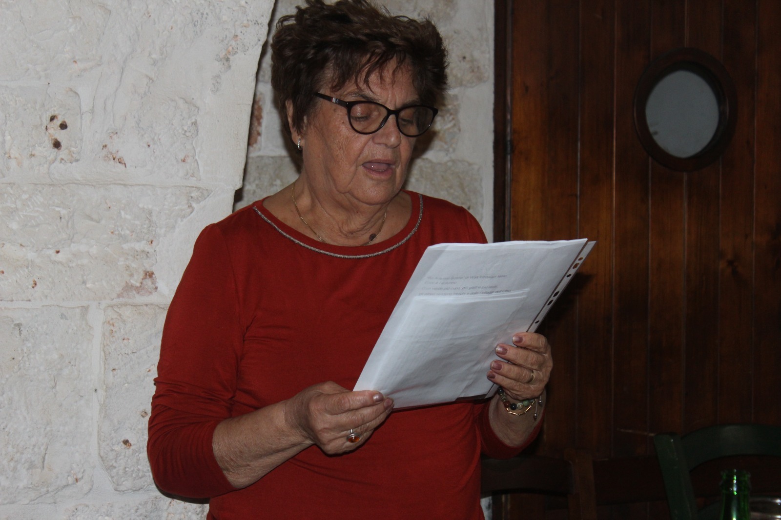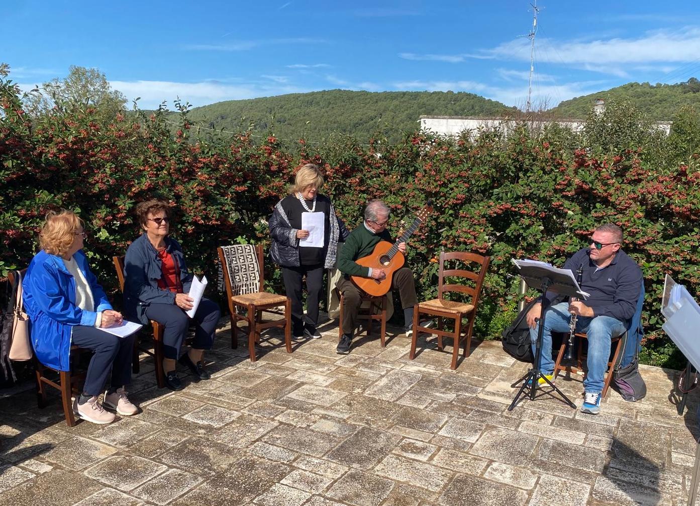 La poesia “Autunno antico” di Angela Decarolis, pervasa dalla nostalgia del tempo felice e puro dell’infanzia, trasporta attraverso diversi “quadretti” in un tempo che si è perso e vana è la sua ricerca. Della stessa autrice “Passeggiata nel bosco in una mattina d’autunno”, un testo in prosa in cui si assapora con i cinque sensi la bellezza del bosco, dopo la prima pioggia autunnale. Alcuni odori e sapori dell’autunno di un tempo rivivono nei ricordi di Natalizia Pinto nel brano “Dolci con il cotto”. Lei, bambina, presso la cantina della casa paterna, con gesti ancestrali, si adoperava nella cottura del mosto che diveniva vin cotto. Grazia Mastro ci ha fatto rivivere questo dolce ricordo con la lettura di questa pagina. La Pinto, nella scelta dei testi, non ha trascurato gli autori classici che hanno trattato le suggestioni autunnali e le connessioni profonde con i sentimenti dell’uomo. La stessa Mastro ha letto un brano tratto da “Demian” di Hermann Hesse, una prosa poetica ricolma di attesa, speranza e anelito alla vita, in cui l’albero attende la sua sorte, sospeso tra morte e vita. Anche l’uomo, come l’albero, aspetta la primavera. Angela Pinto ha declamato “Autunno” di Vincenzo Cardarelli, “Ecco l’autunno” di Walt Whitman, Angela Romanazzi “Foglie gialle” di Trilussa”. Rina Valente ha recitato una poesia di autore anonimo, un ricordo della sua infanzia: nel giorno della commemorazione dei defunti, la pietà del cielo si è posata su una tomba dimenticata, lasciando una rosa rossa che a primavera porterà nuovi germogli. Un omaggio al Canale di Pirro è la poesia “La nebbia nel canale”, scritta e letta da Natalizia Pinto: un momento di grazia che l’autrice vive in un mattino d’autunno, guardando dalla via Silvana, giù nella valle. La prima parte dell’incontro si è conclusa con la canzone ”L’amour” di Edith Piaf, interpretata da Ada De Bellis, e con i brani “Solo tu nell’universo” e “il mondo”, eseguiti al clarinetto da Leo Rizzo. A questo punto, il presidente Mastro ha invitato tutti a fare una passeggiata nei sentieri solitari di Cocolicchio. Qui si è potuto ammirare un paesaggio bucolico caratterizzato da armonia e serenità, che evocava suggestioni antiche e che invitava alla lettura e alla riflessione. Così sotto una quercia, Katia De Laurentiis ha declamato la poesia “L’estate è finita” di Emily Dickinson. Questa giornata d’autunno si è conclusa con il pranzo presso la Locanda Ventura, durante il quale Ada De Bellis ha cantato “Concerto d’Autunno” di Caterina Valente e l’artista Antonella Aquaro ha declamato la poesia della Pinto “17 novembre 1998”: l’aria di novembre e la musica s’incontrano, donando serenità all’anima. Dulcis in fundo, davanti a un cestino di caldarroste fumanti, l’Aquaro ha concluso, recitando con brio due raffinate filastrocche della professoressa Mina Del Giudice “Vita in natura” e “La castagna del Pollino”, in cui emergono gli aspetti più festosi dell’autunno: i frutti, “i sapori giganti”, le castagne scoppiettanti nel camino, il vino o il festante spumante.