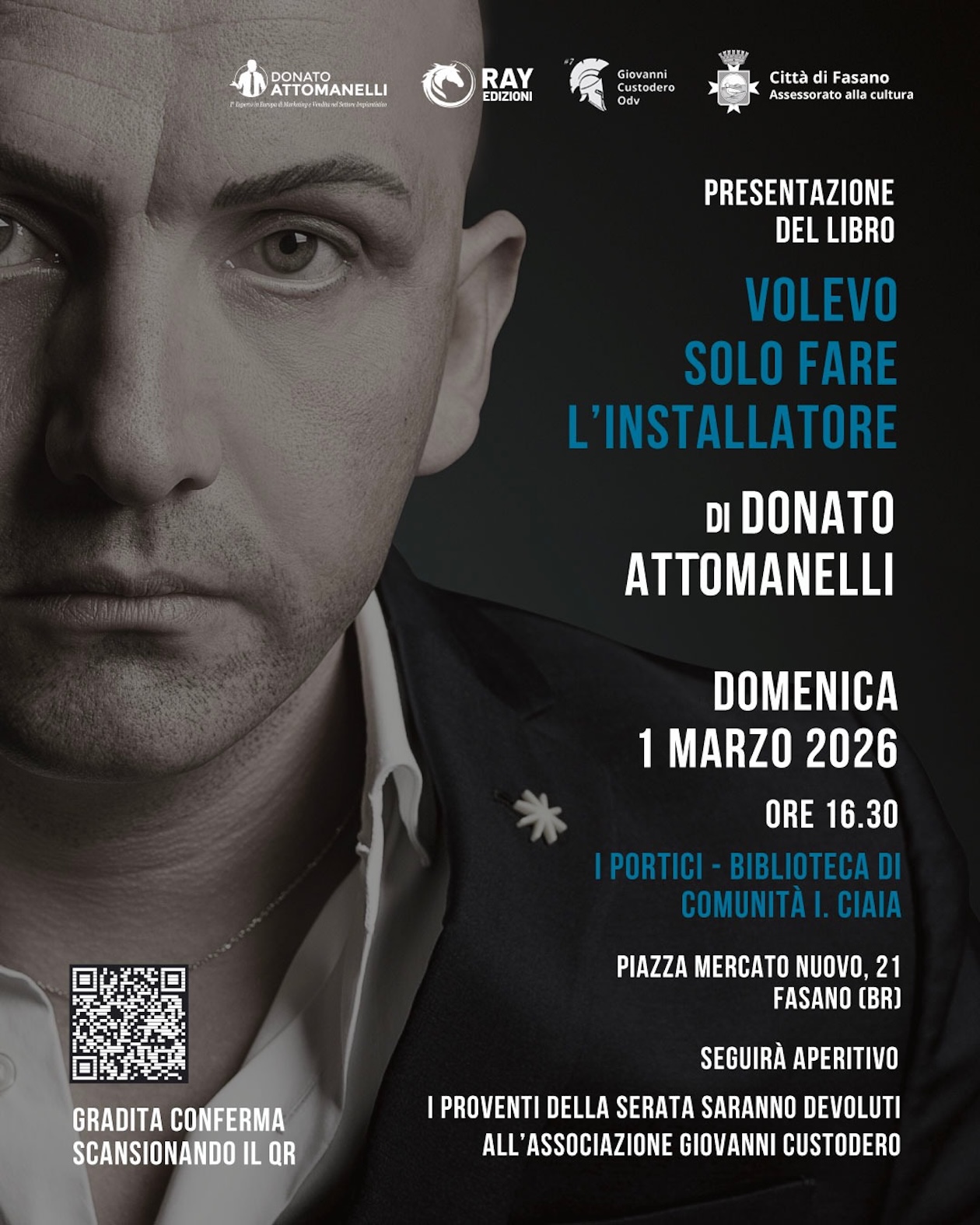 Fasano – Sarà presentato il 1° marzo 2026 il libro storia di Donato Attomanelli, giovane imprenditore fasanese che ha fatto della sua passione per la tecnologia e l’impiantistica una vera e propria professione che lo ha portato ai vertici del marketing europeo.