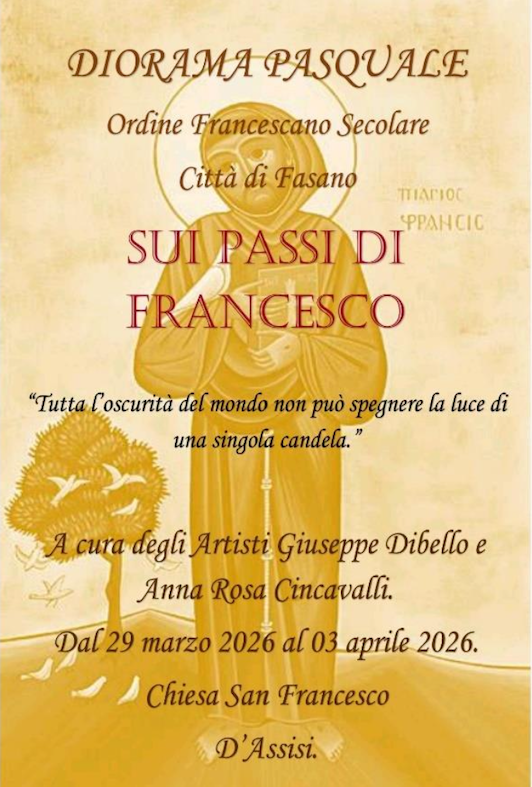 FASANO – La Settimana Santa fasanese si arricchisce di un appuntamento che coniuga devozione secolare e talento artistico locale. Dal 29 marzo al 3 aprile 2026, la Chiesa di San Francesco d’Assisi ospiterà un maestoso Diorama Pasquale, un’opera carica di simbolismo nata dalla collaborazione tra l’Ordine Francescano Secolare di Fasano e i giovani artisti Giuseppe Dibello e Anna Rosa Cincavalli.+3