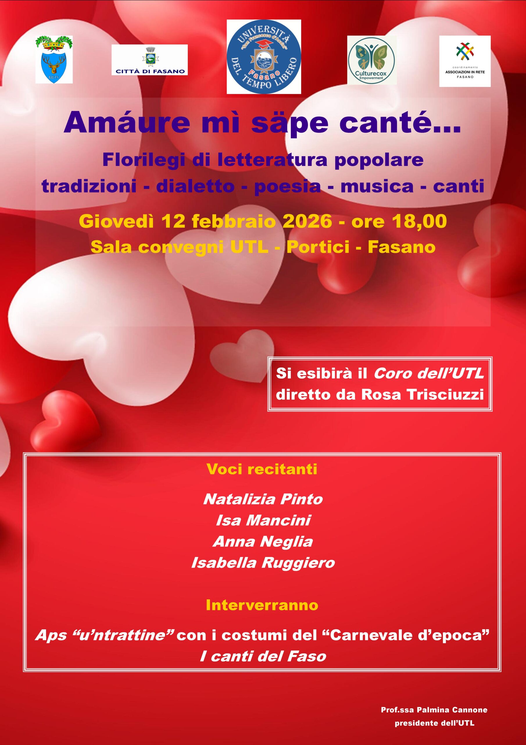Fasano – Con l’iniziativa «Amáure mì säpe canté… Florilegi di letteratura, tradizioni, dialetto, poesia, musica, canti», 7ª ed., la locale Università del Tempo Libero San Francesco d’Assisi, giovedì 12 febbraio, alle ore 18,00, nella propria Sala Convegni (Portici), celebrerà l’Amore universale e il Giovedì Grasso.  «Siamo convinti – afferma Palmina Cannone – che, se l’amore fosse più rigoglioso, nel mondo ci sarebbe la Pace agognata da tanti, ma ancora lontana. Tutti parlano di questo sentimento che accomuna gli esseri viventi, ma siamo educati ad amare? Sappiamo veramente amare gli altri, il diverso, la Terra, la natura, i bambini, gli anziani? Forse ci sono in giro troppi amori malati, ipocriti, puerili, egoistici, utilitaristici. L’amore è un dare che non pone condizioni, e non decide nulla. Nel dare amore ci si evolve. L’amore universale è infinito. Questo il messaggio della nostra Università». Del resto tale è il significato autentico della festa di San Valentino, celebrata in tutto il pianeta il 14 febbraio (che l’UTL sta anticipando), e voluta da Papa Gelasio, nel 496 d. C., stanco di assistere alla licenziosità dei Lupercalia, festa pagana legata a una divinità romana, indetta per tenere lontano dai campi coltivati i lupi. La scelta cadde su San Valentino, che dedicò la sua vita alla conversione dei pagani al Cristianesimo. Aureliano ne ordinò la flagellazione e l’uccisione il 14 febbraio 273 d. C.. La leggenda narra essere stato lui a celebrare il matrimonio tra un legionario pagano e una giovane cristiana. La presidente Cannone traccerà un breve excursus sull’evoluzione dell’amore nella letteratura italiana e popolare con la collaborazione delle socie Natalizia Pinto, Isa Mancini, Anna Neglia, Isabella Ruggiero (voci recitanti) e del Coro dell’UTL, diretto da Rosa Trisciuzzi di Musicando.